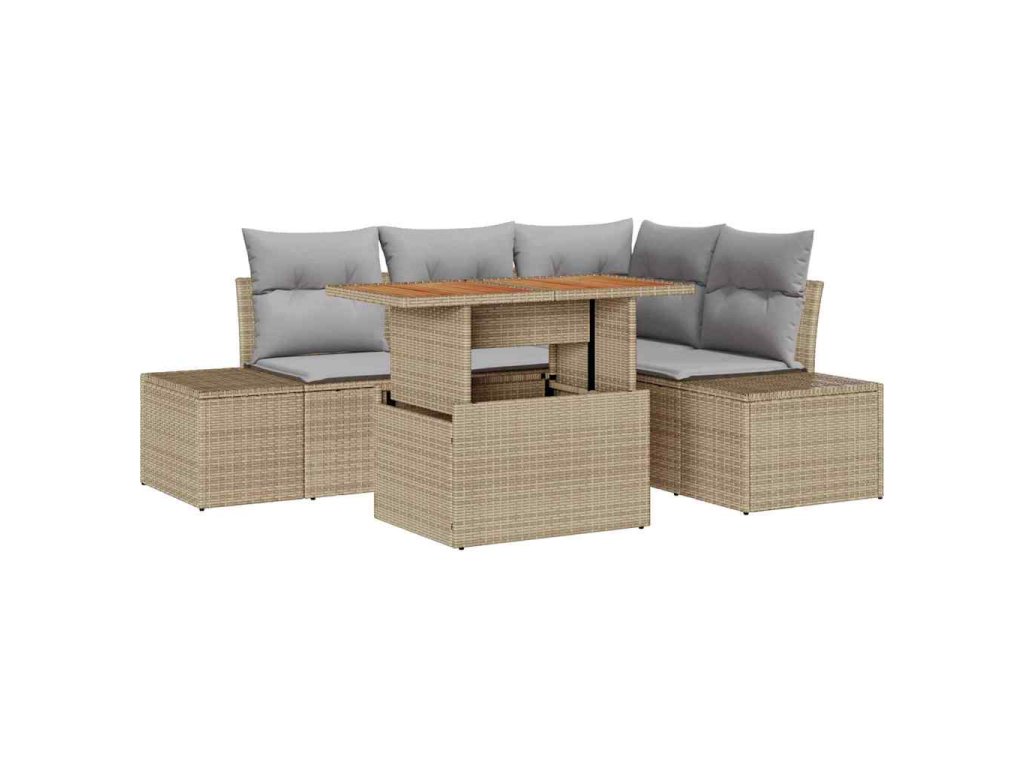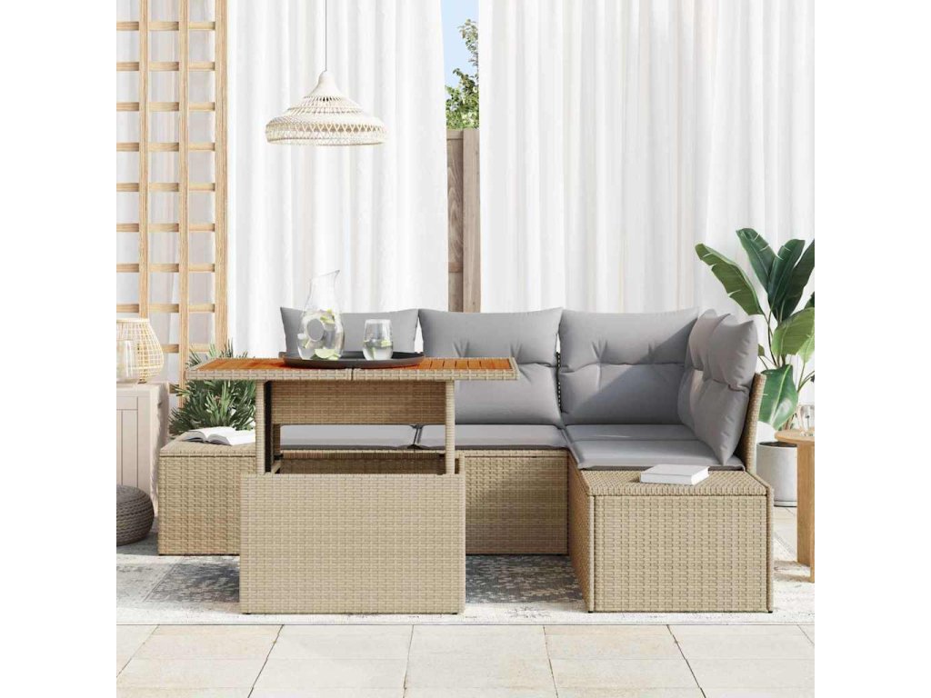 - Stylový Design: Jeho elegantní vzhled se hodí k různým venkovním stylům a dodává tvým terasám a balkonům pěkný nádech. Béžový polyratan a šedé polštáře vytvářejí svěží, trendy atmosféru.