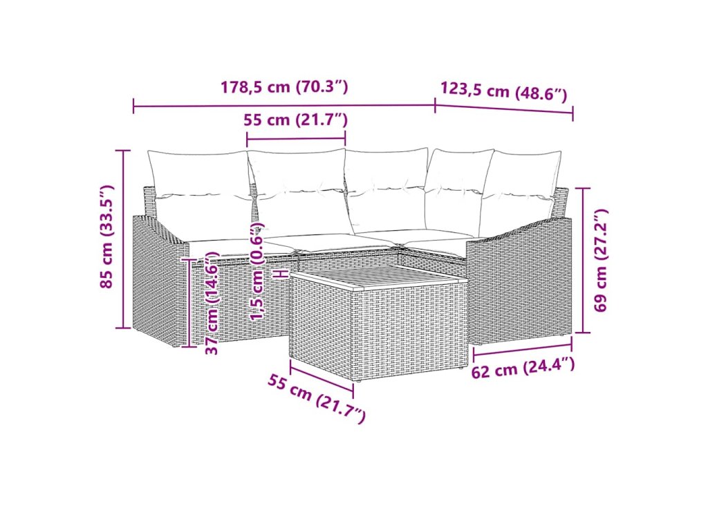 - Co je v balení: 1 x střední sedadlo včetně úložné funkce, 1 x rohové sedadlo včetně úložné funkce, 2 x armsofa včetně úložné funkce, 1 x zahradní stůl