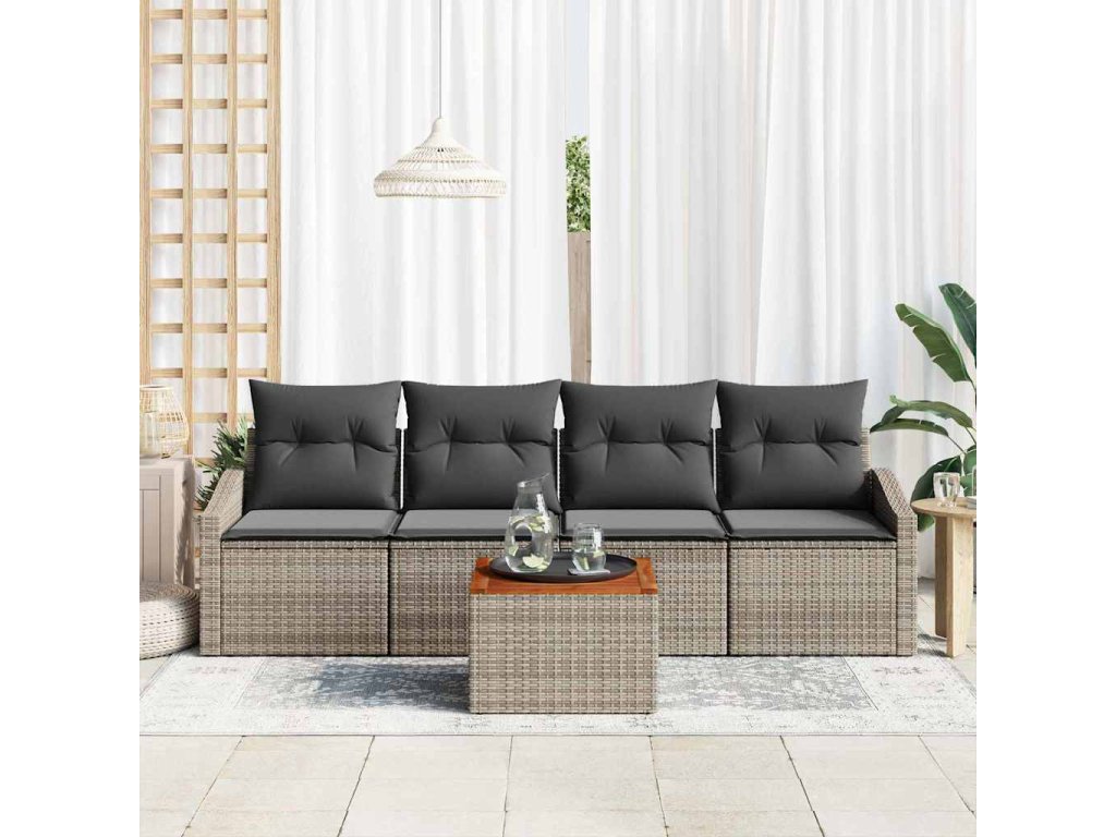 - Součásti: Sada obsahuje dvě středové sedačky, dvě pohovky s opěrkami a zahradní stůl, každý kus zpracován tak, aby podporoval bezproblémové venkovní uspořádání. Tyto prvky se přizpůsobují dynamickým rozvržením, měnícím se podle potřeb vašich setkání. Každé sedadlo zvýrazňuje pohodlí díky ergonomicky skloněným opěrkám a velkému polstrování.
