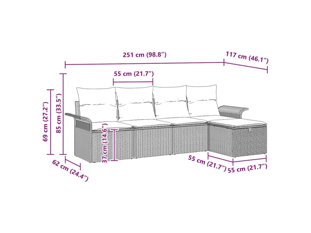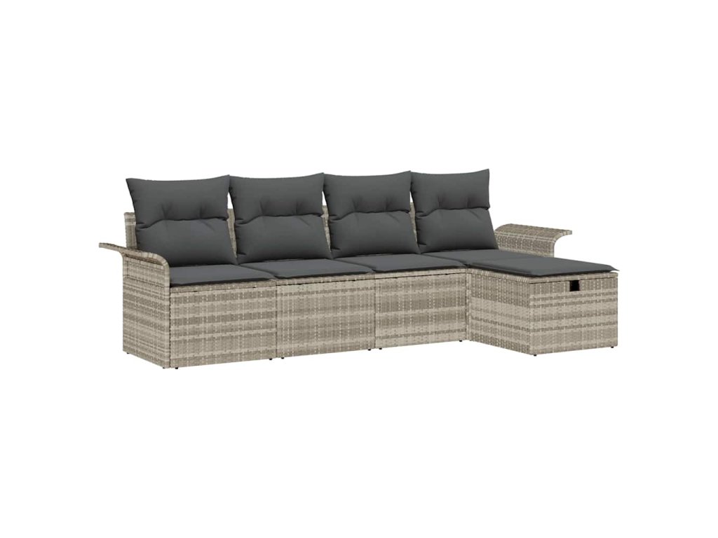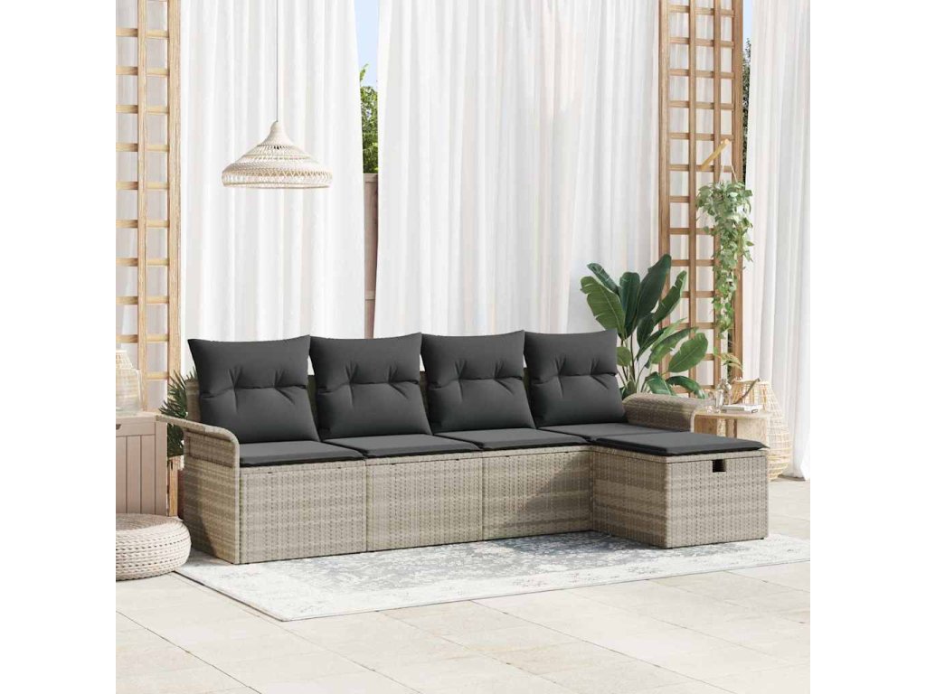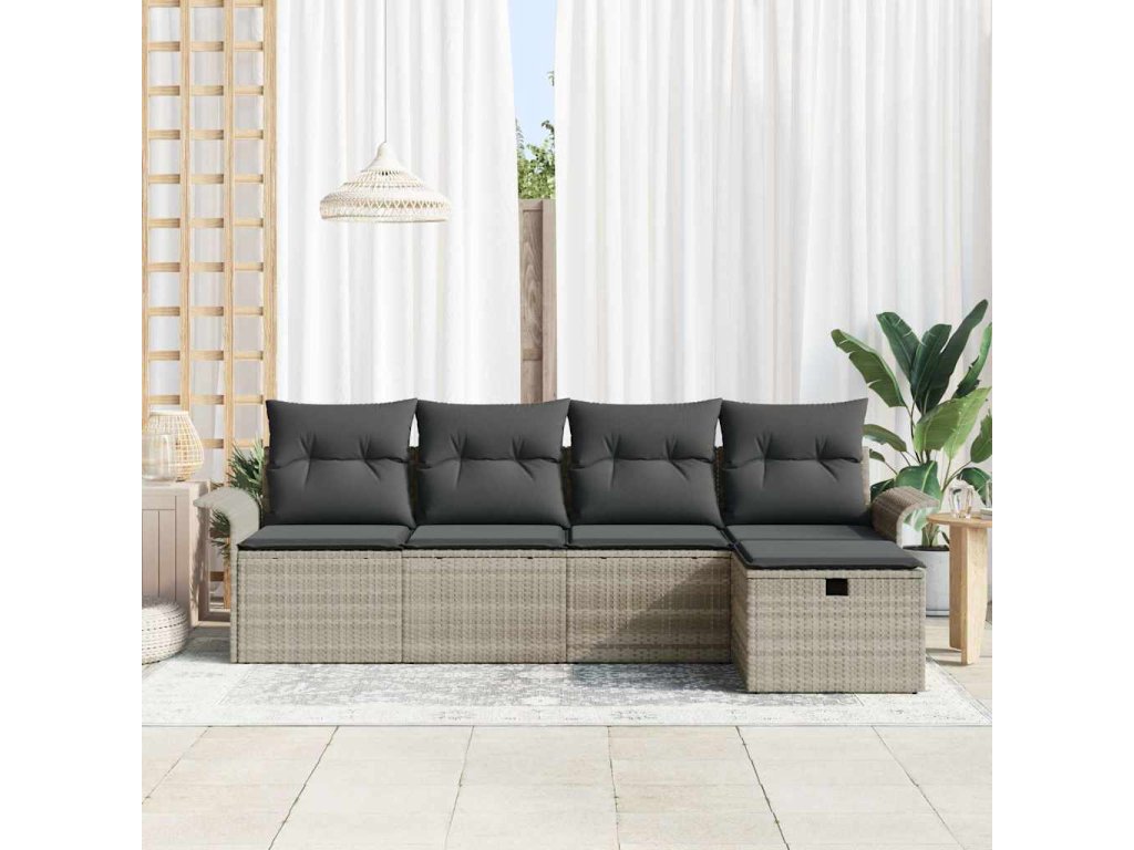 Tato 5dílná zahradní pohovková souprava s polstry je ideální pro tvůj venkovní odpočinek a promění tvou terasu, balkon nebo zahradu na pohodlné a stylové místo. S moderním designem a dostatkem místa k sezení je to ideální na slunečné dny i příjemné večery s přáteli a rodinou, abys maximalizoval čas venku.