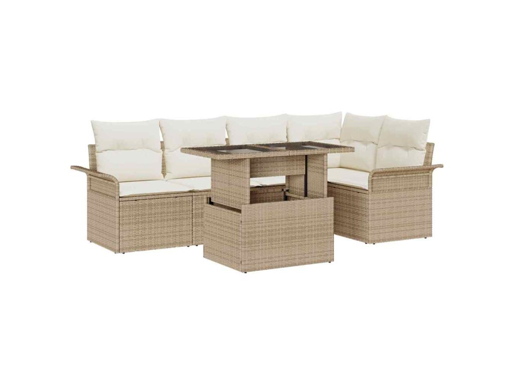 Tahle zahradní sedací souprava má moderní atmosféru, která oživí váš venkovní prostor a udělá z vaší terasy nebo balkonu ideální místo k relaxaci. Mix béžového poly ratanu a pohodlných bílých polštářů vytvoří příjemnou atmosféru pro odpočinek nebo zábavu.