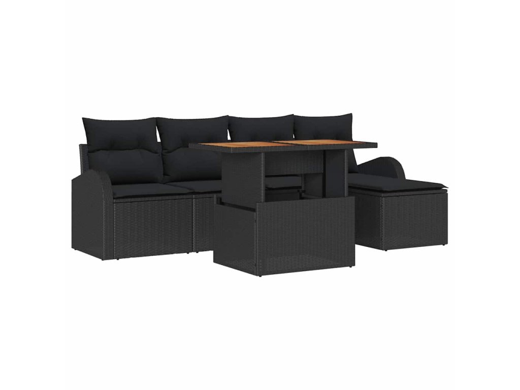 Tento zahradní jídelní set je kombinací stylu a užitečnosti. Perfektní na venkovní setkání nebo klidné chvíle na zahradě. Tmavě šedý ratan a elegantní černé polštáře mu dávají šmrnc, ideální na venkovní stolování nebo odpočinek.