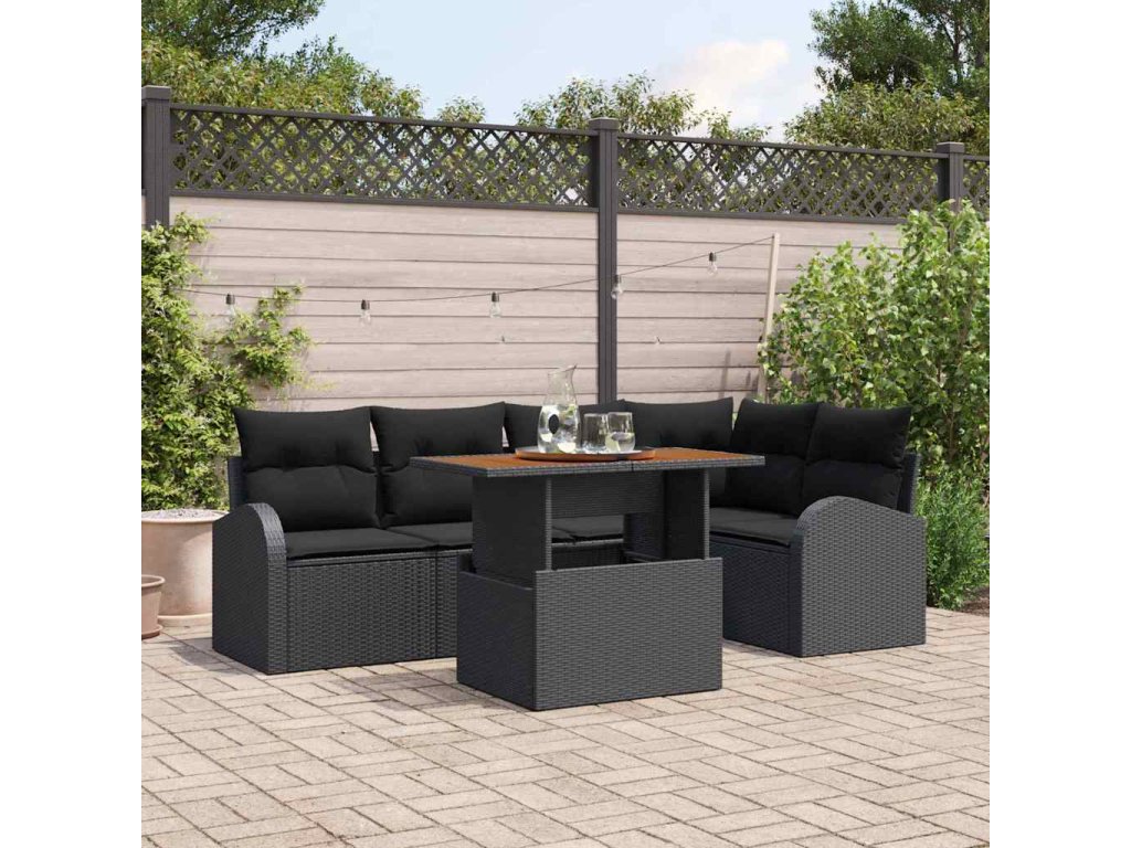 Tento zahradní jídelní set je zaměřen na styl a praktičnost, ideální pro vychutnání si venku. Elegantní černý poly ratanový rám v kombinaci se zvětralým akáciovým dřevem mu dodává moderní styl, který vylepší každou zahradu nebo patio. Nabízí pohodlné sezení a přidává trochu elegance k tvým venkovním setkáním.