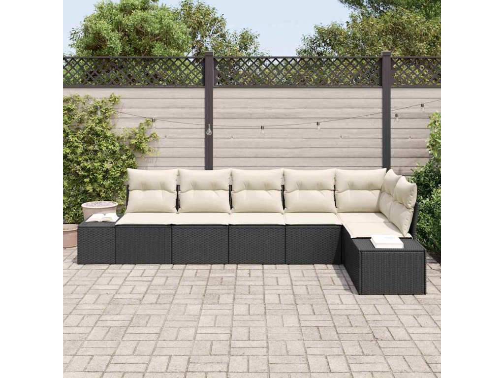Tato 6-dílná sada zahradních pohovek s polštáři je prostě skvělá. Spojuje styl a funkčnost, takže je ideální na terasu, balkon nebo do zahrady. Je vyrobená z odolného poly ratanu a polyesteru, pojme pohodlně až šest lidí, ideální na společenské akce nebo lenošení venku.
