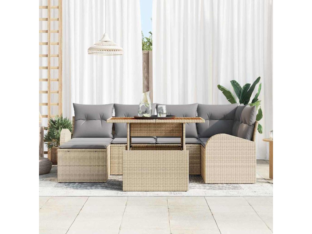 - Co v balení: 2 x rámová sofa s úložným prostorem, 1 x rohové sedadlo s úložným prostorem, 2 x středová sedadla s úložným prostorem, 1 x podnožka s úložným prostorem, 1 x zahradní stůl