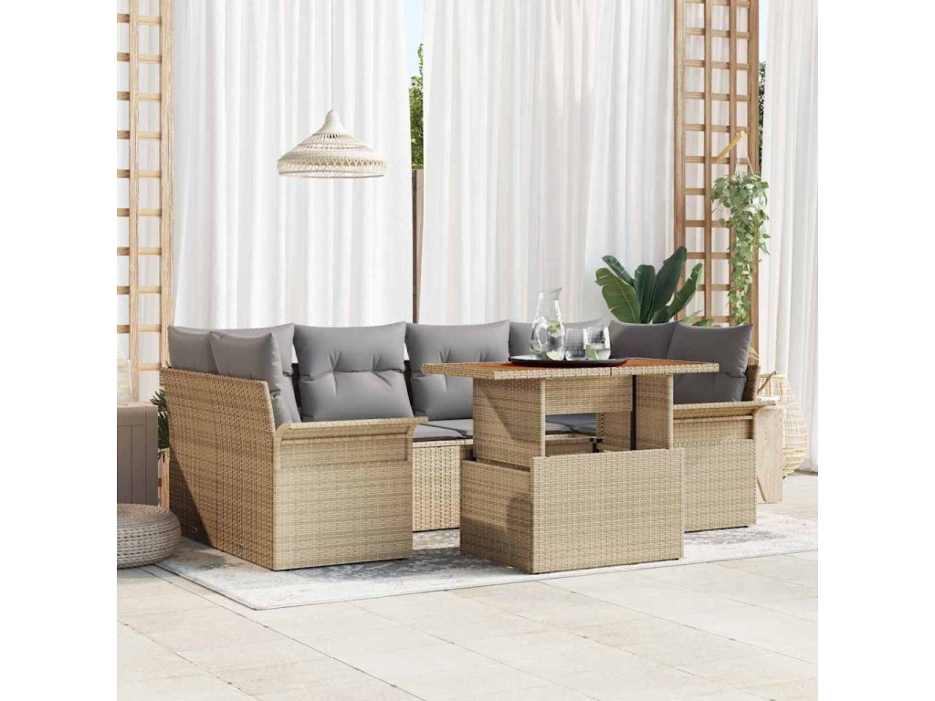 - Materiály: Vyrobená z poly ratanu, práškově lakované oceli a masivního akáciového dřeva, tato zahradní souprava slibuje odolnost a nadčasovou eleganci. Poly ratan dodává sofistikovanou tkanou texturu, zatímco prášková ocel zajišťuje pevnost rámu. Povrchová úprava z akáciového dřeva přidává kousek přírody, čímž vytváří harmonické venkovní prostředí.
