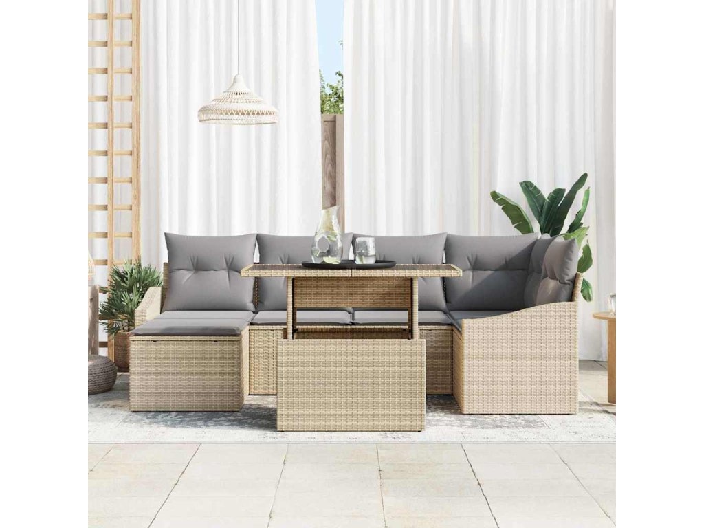 Tato zahradní pohovková souprava složená ze sedmi kusů je perfektní kombinací relaxace a stylu. S moderním nádechem a krásným béžovým a šedým poly ratanovým povrchem se hodí skvěle na každou terasu, balkon nebo zahradu. Nabízí pohodlné sezení pro skvělá setkání nebo lenošení pod hvězdami.