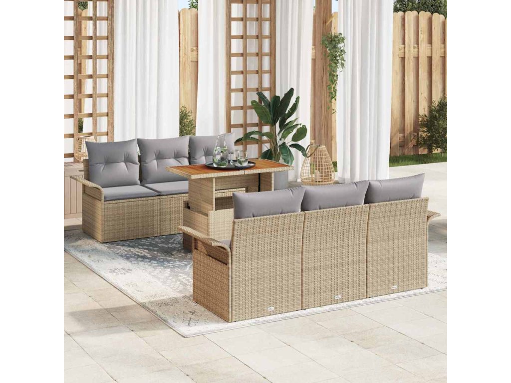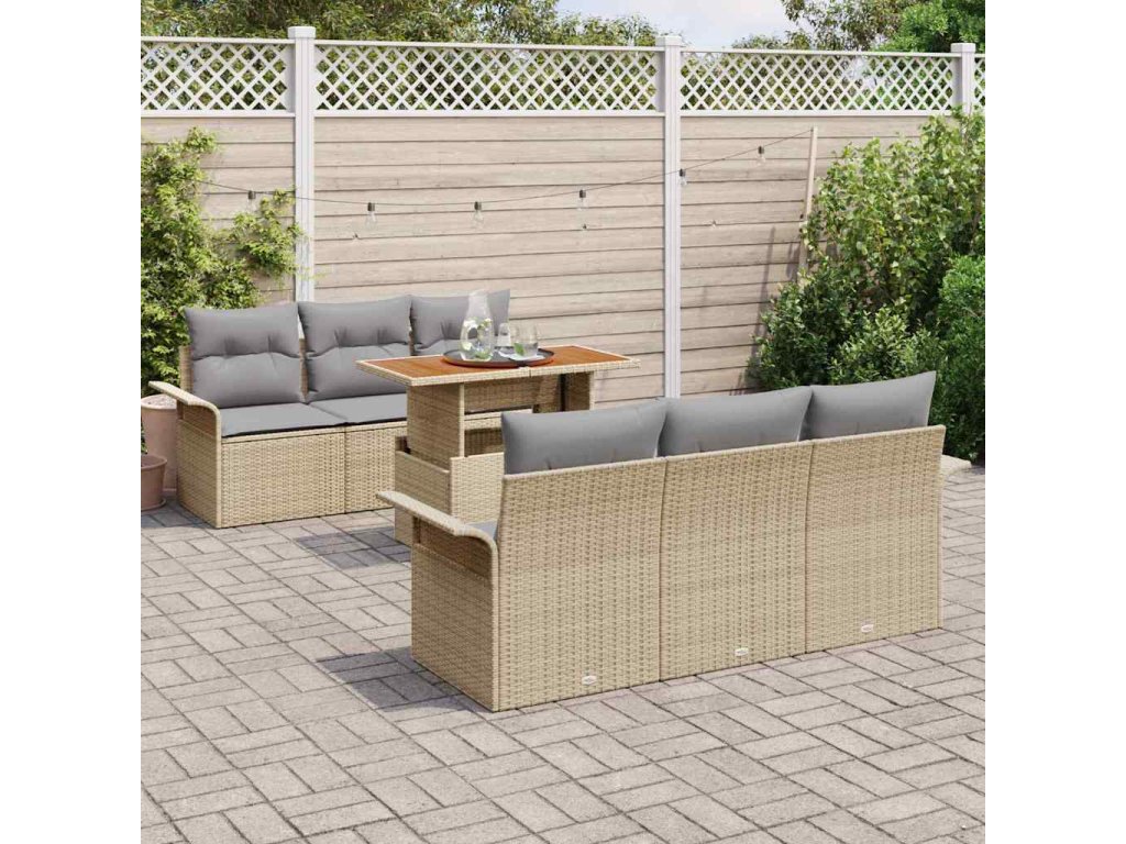 Tato krásná zahradní sedačka promění tvůj venkovní prostor na pohodlné místo pro odpočinek s rodinou a přáteli. Moderní kombinace béžového poly ratanu a šedých polštářů nevypadá jen skvěle, ale i se tak cítí – ideální pro terasu nebo balkon.
