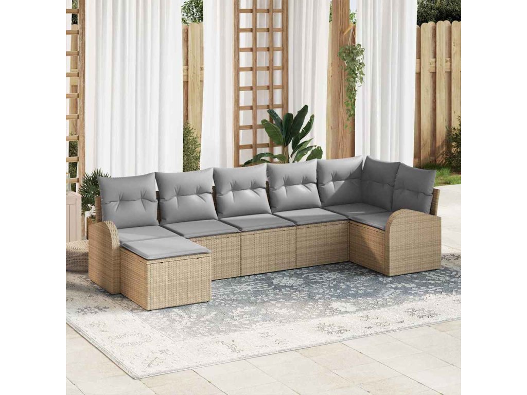 Tato modulární venkovní pohovka pro 7 lidí je perfektní doplněk každé zahrady nebo terasy. Kombinuje moderní styl s praktickým použitím. Poly ratanový exteriér má pěkné tkané detaily, které jí dodávají cool vzhled. Je navržená na venkovní použití, skvěle se hodí na společenské akce i na klidné lenošení. Sada obsahuje různé moduly, které si můžeš uspořádat podle sebe na různé příležitosti.