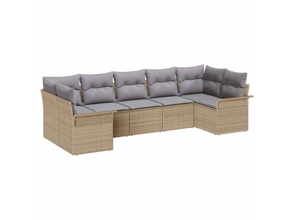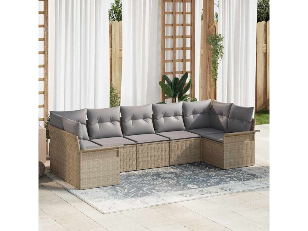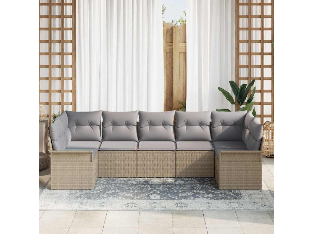 Tento venkovní pohovkový set je ideální pro chillování na zahradě nebo patio, skvělý na setkání s kamarády a rodinou. Elegantní béžový poly ratan v kombinaci se šedými polštáři vytvářejí stylové a pohodlné sezení, které skvěle vypadá venku.