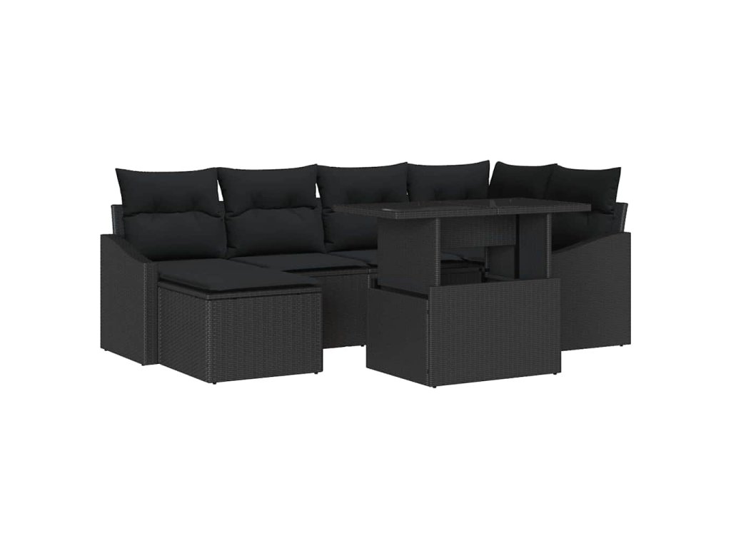 Tato sedmičlenná zahradní pohovková sada redefinuje relaxaci a styl. S moderním vzhledem a elegantním matným černým poly ratanem hezky zvedne každou terasu nebo balkon a poskytne pohodlné sezení na setkání nebo klidné večery pod hvězdami.