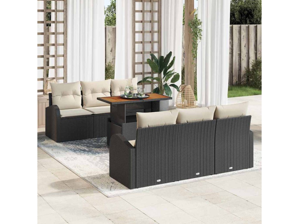 - Vícefukční design: Tento chytře navržený set zahrnuje čtyři křesla, dvě sedící sekce a stůl z akáciového dřeva, vše s úložnými možnostmi. Nízký stůl není jen pro stolování, ale také jako dekorativní prvek. Židle maj vestavěný úložný prostor na polštáře nebo zahradní potřeby, což usnadňuje venkovní život.