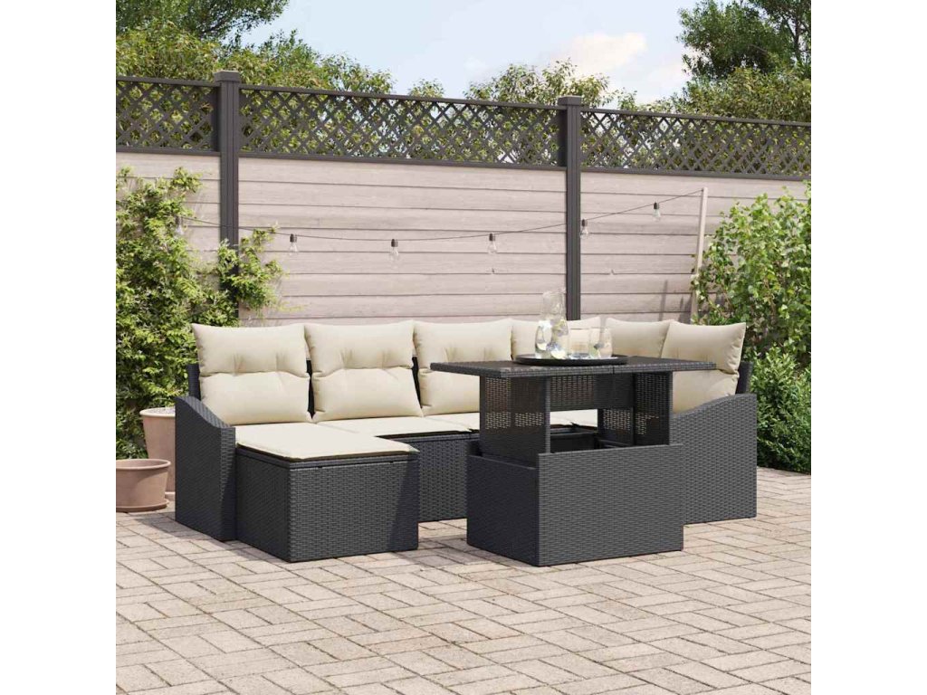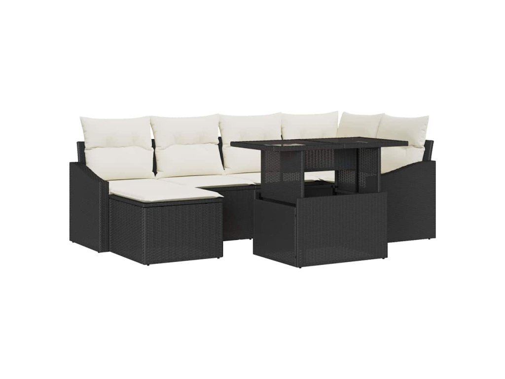 Tato sedmikusová zahradní pohovková souprava nabízí pohodlné sezení ve stylovém designu. Skvěle vypadá s moderním černým polyratanem, takže ji můžeš umístit na terasu, balkon nebo do zahrady. Je to ideální místo pro pohodové posezení nebo večery pod hvězdami.