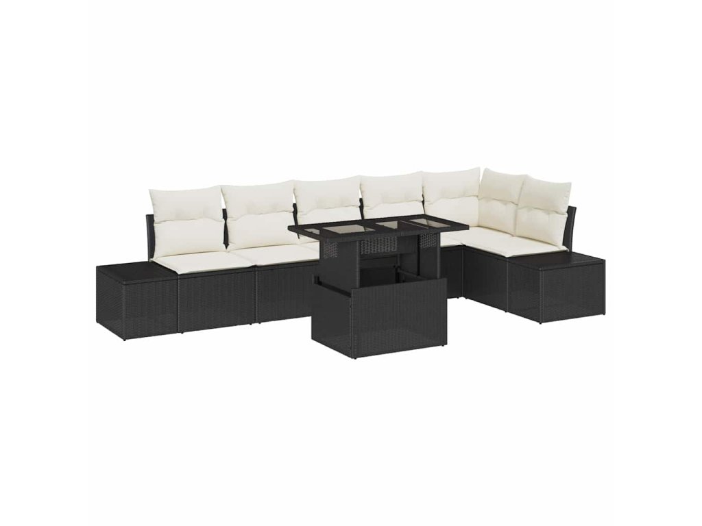 - Dodávka obsahuje: 2 x boční sedačka se storage, 1 x rohové sedadlo se storage, 3 x středové sedačky se storage, 1 x zahradní stůl
