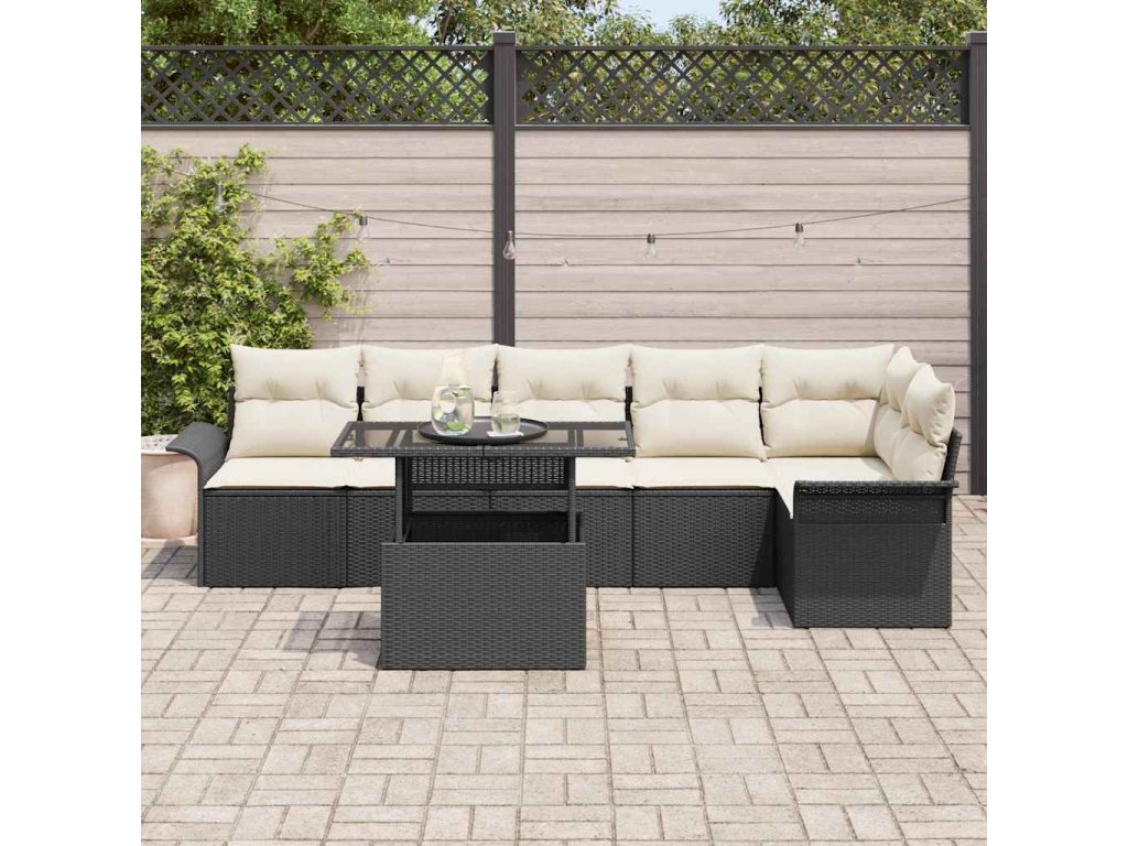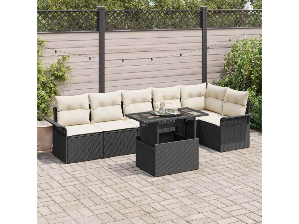 Sada modulárních venkovních pohovek je ideální pro oživení vašeho venkovního prostoru a skvěle kombinuje styl s pohodlím. S elegantním černým ratanovým povrchem a krémovými polštáři má klasický nádech, což ji dělá skvělou volbou pro hosty nebo k lenošení na zahradě.