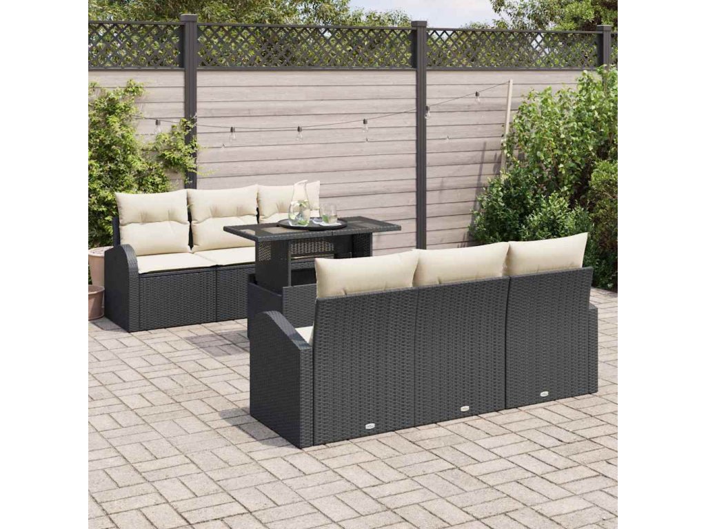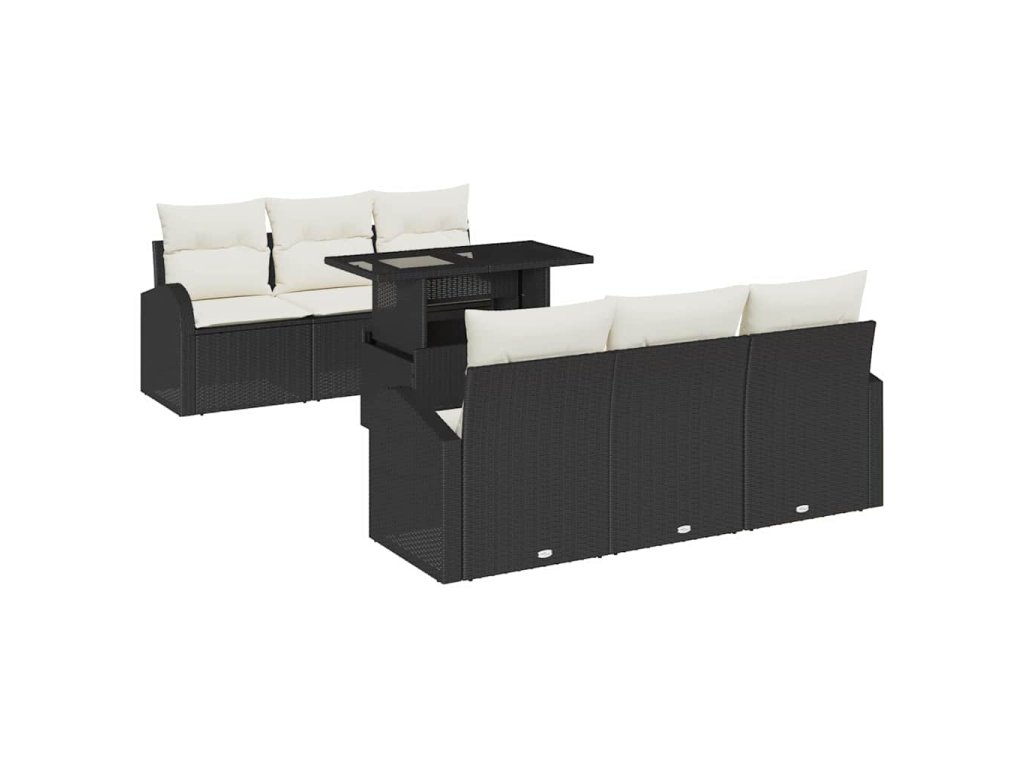 Tato 7dílná zahradní pohovka z odolného syntetického polyratanu je skvělou volbou pro venkovní luxus a pohodlí. Její černý rám a krémové polštáře krásně vynikají, dělají z ní lákavý prvek pro každou zahradu, patio nebo balkon, a poskytují pohodlí pro odpočinek nebo lenošení.