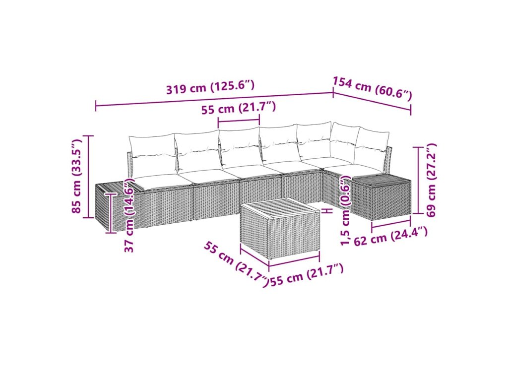 Tento 7-dílný zahradní sofa set je ideální pro relaxaci venku s elegantním designem a praktickými vlastnostmi. Skládá se ze silných materiálů, jako jsou polyratan a textilie, takže nejenže zkrášlí tvou terasu nebo zahradu, ale také nabídne pohodlné místo na povalování.