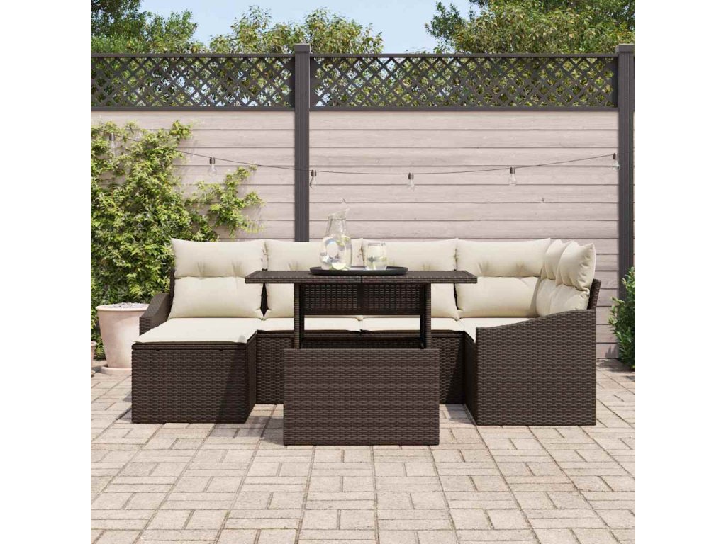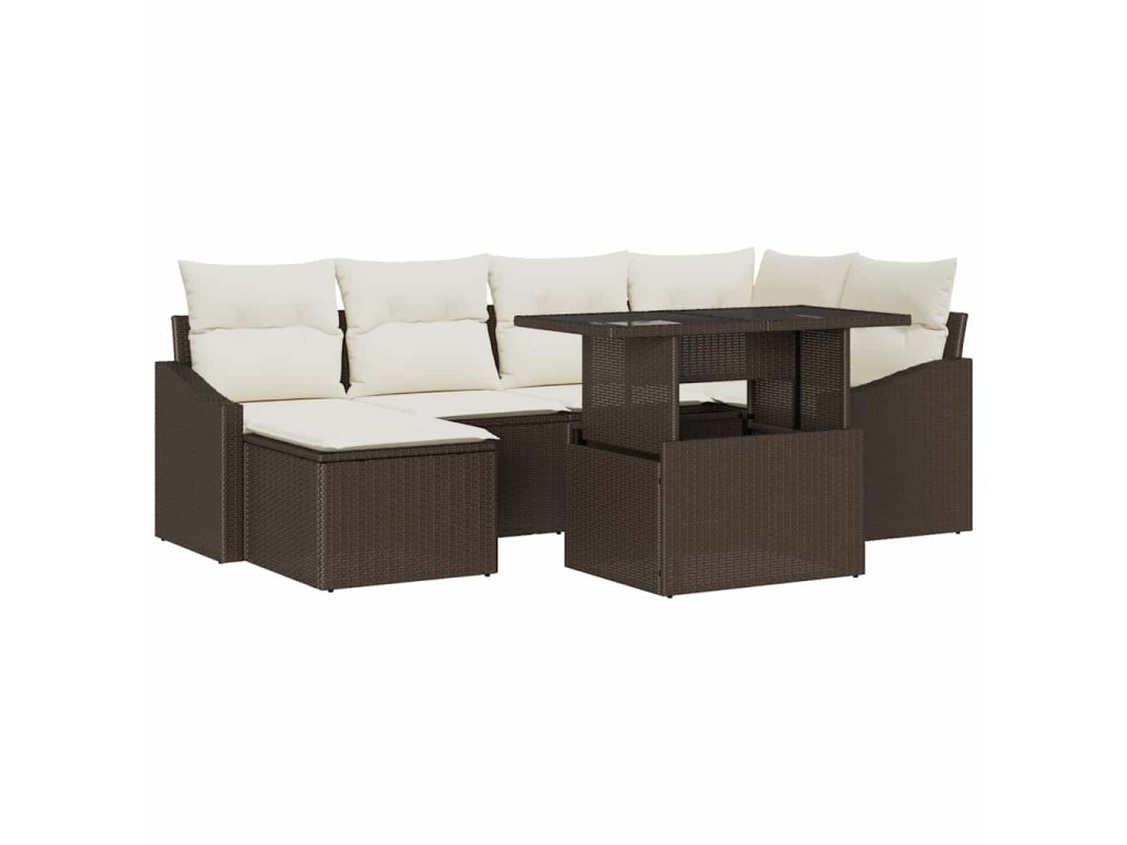 Tato sedmidílná sada zahradních pohovek se zaměřuje na pohodlí a styl pro tvůj venkovní prostor. S trendy hnědým poly ratanovým povrchem je ideální pro odpočinek na tvém patio, balkonu nebo zahradě, a dostatečně pohodlná pro klidné večery nebo setkání.