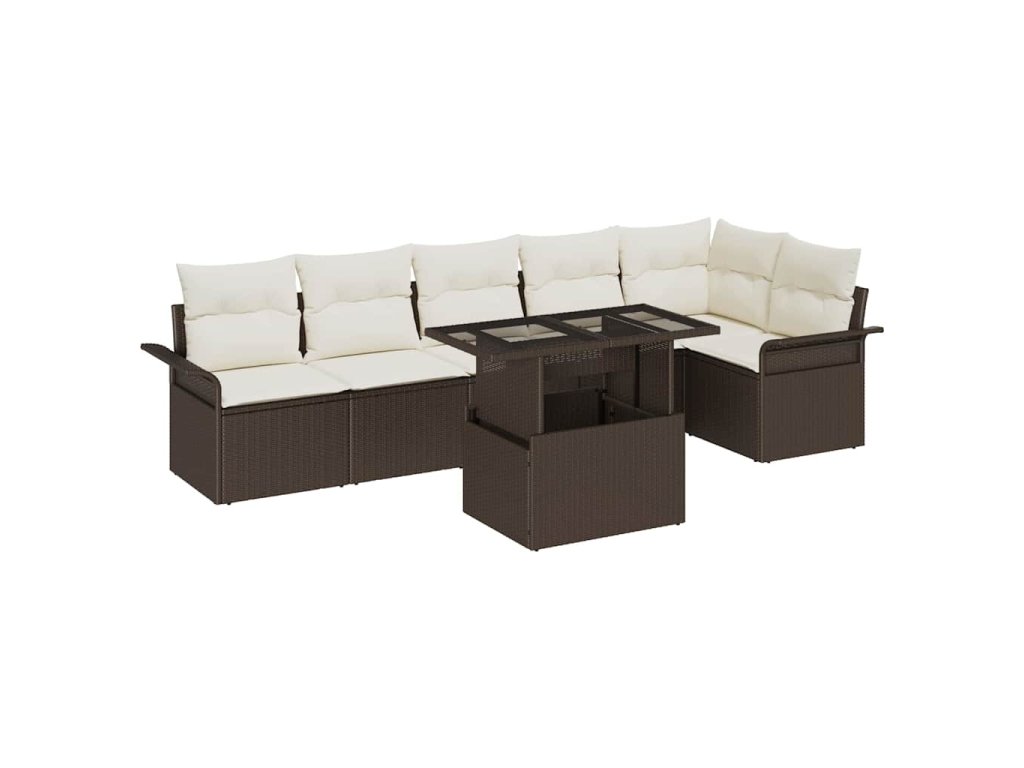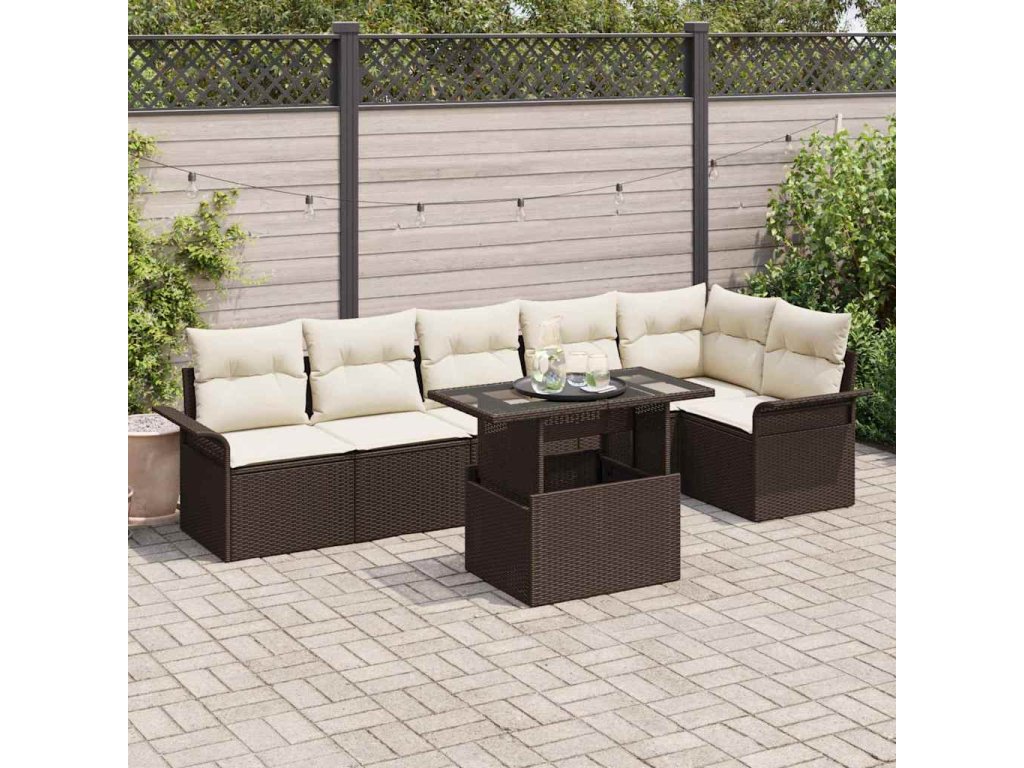 Tato 7-dílná modulární venkovní pohovková souprava je skvělá pro oživení vašeho venkovního prostoru, spojuje styl a pohodlí. Hladký hnědý ratanový povrch s krémovými polštáři jí dodává elegantní vzhled, takže je ideální na hostiny s přáteli nebo jen na poklidné večery v zahradě.