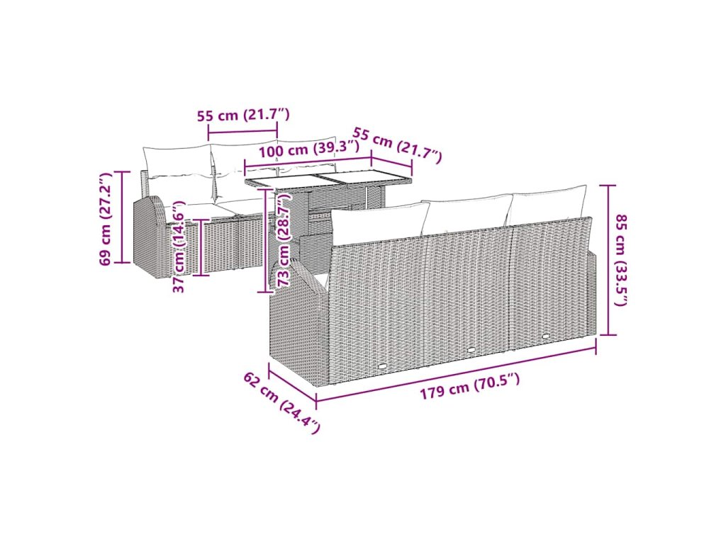 Tento zahradní pohovkový set vám přináší skvělou kombinaci stylu, pohodlí a versatility do vašeho venkovního prostoru. Je navržený pro zahrady a terasy a pohodlně se do něj vejde 7 lidí, což ho dělá ideálním pro velké akce. Jeho moderní obdélníkový tvar a tkaný design skvěle ladí s moderními venkovními prostory. Práškový nátěr dodává extra šmrnc a promění jakýkoli balkon, terasu nebo patio v útulné místo.