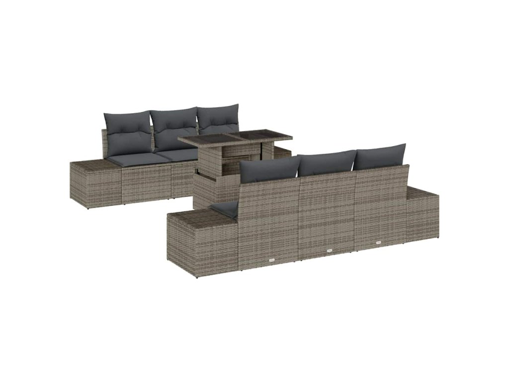 Tato krásná sada zahradních pohovek spojuje moderní styl s pohodlím. Vyrobená z odolného šedého poly ratanu, obsahuje dvě střední sedadla, čtyři boční pohovky a super stůl. Ideální pro jakýkoli dvůr nebo patio. Texturovaný povrch a jednoduché barvy jí dodávají pěkný vzhled a zajišťují pohodlí pro relaxaci nebo jídlo.