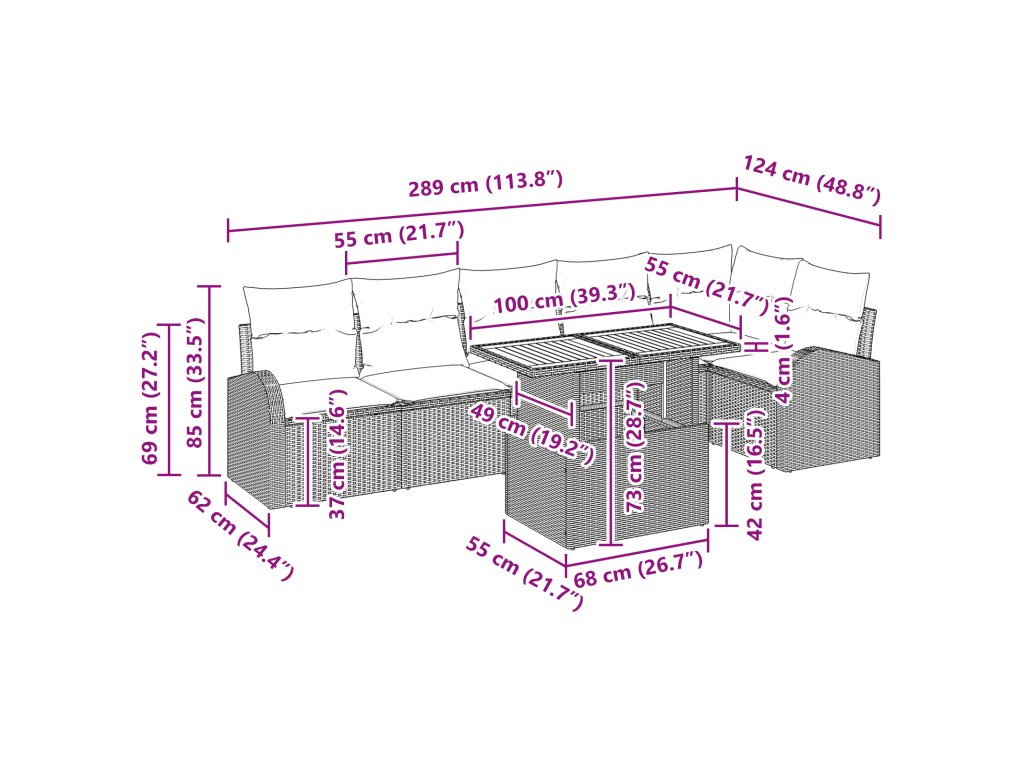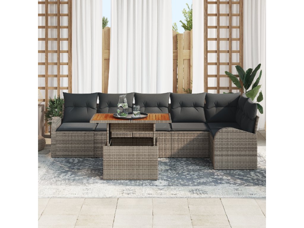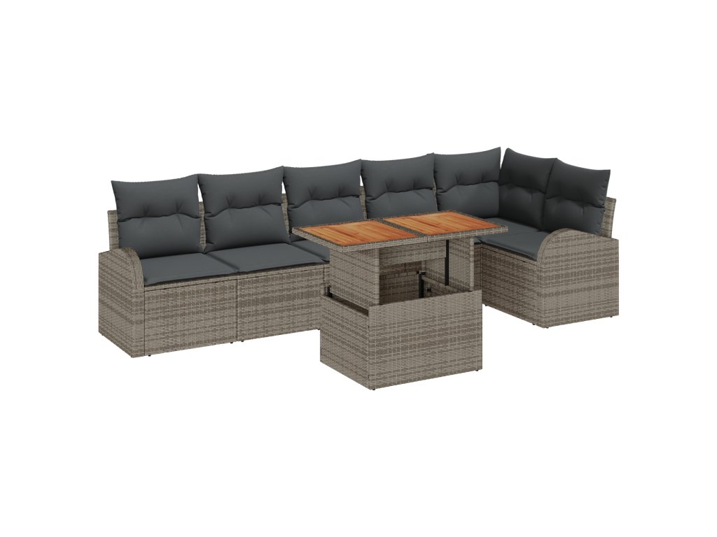 - Dodávka obsahuje: 2 x křeslo s úložným prostorem, 1 x rohové sedadlo s úložným prostorem, 3 x středové sedadlo s úložným prostorem, 1 x zahradní stůl