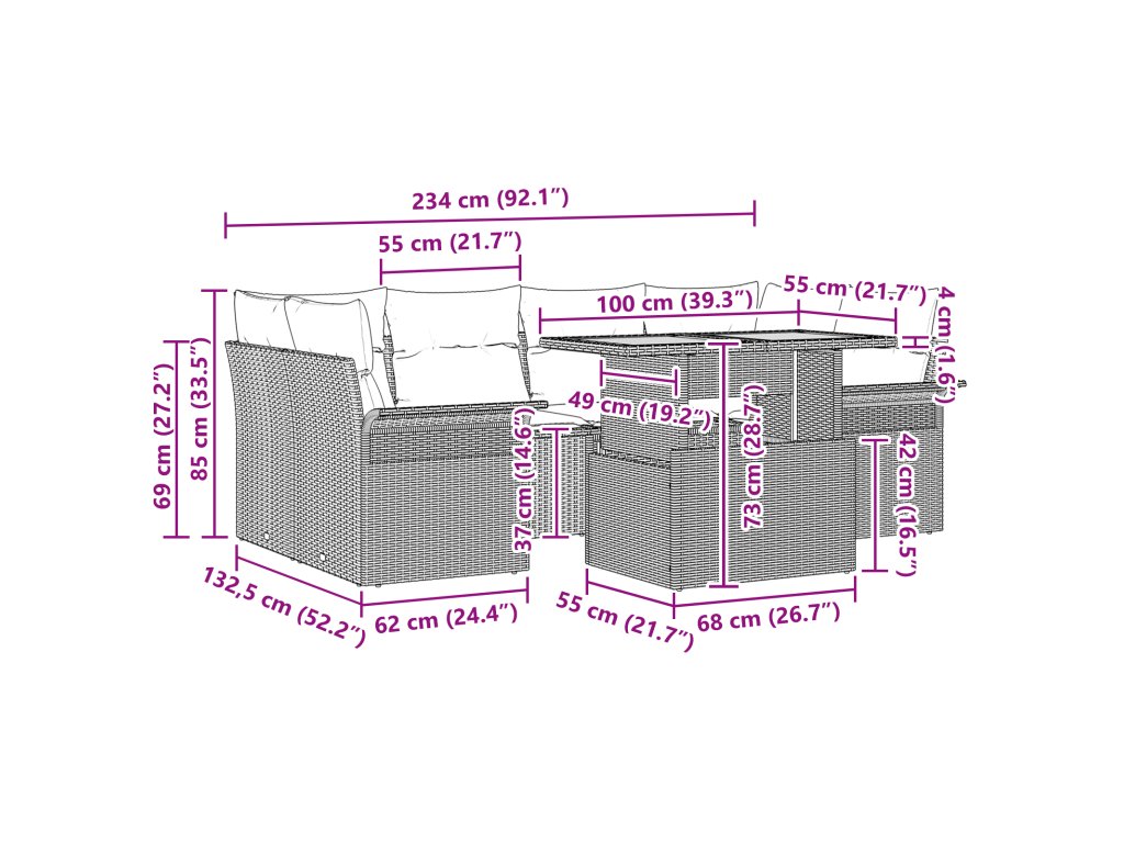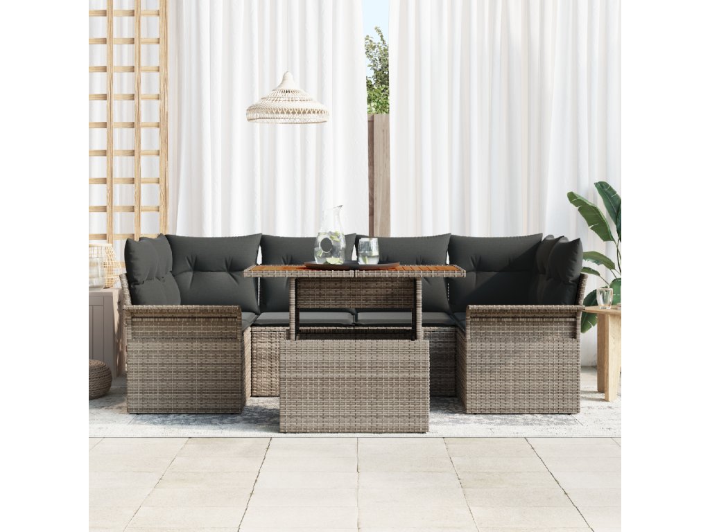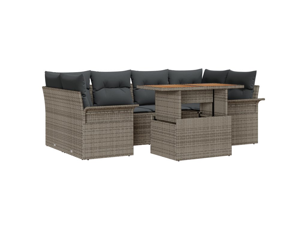 Tento 7dílný set zahradní pohovky je ideální pro venkovní sezení, kombinuje pohodlí a styl. Vyrobeno z odolného poly ratanu a měkkých polyesterových polštářů, dodává vaší zahradě, balkonu nebo terase moderní nádech a vybízí k relaxaci a zábavě s rodinou a přáteli.