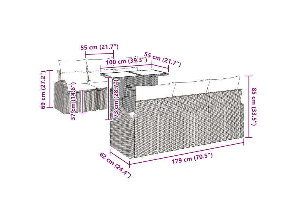 Tato 7-dílná zahradní pohovková souprava, vyrobená z odolného syntetického polyratanu v elegantní šedé barvě, je vrcholem venkovního luxusu a pohodlí. Její stylový design ji dělá skvělým středobodem pro terasy, zahrady nebo balkony a nabízí útulné sezení pro setkání nebo relaxační odpoledne.
