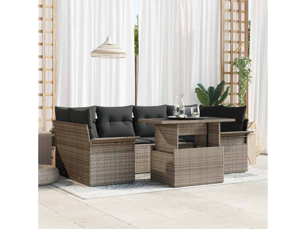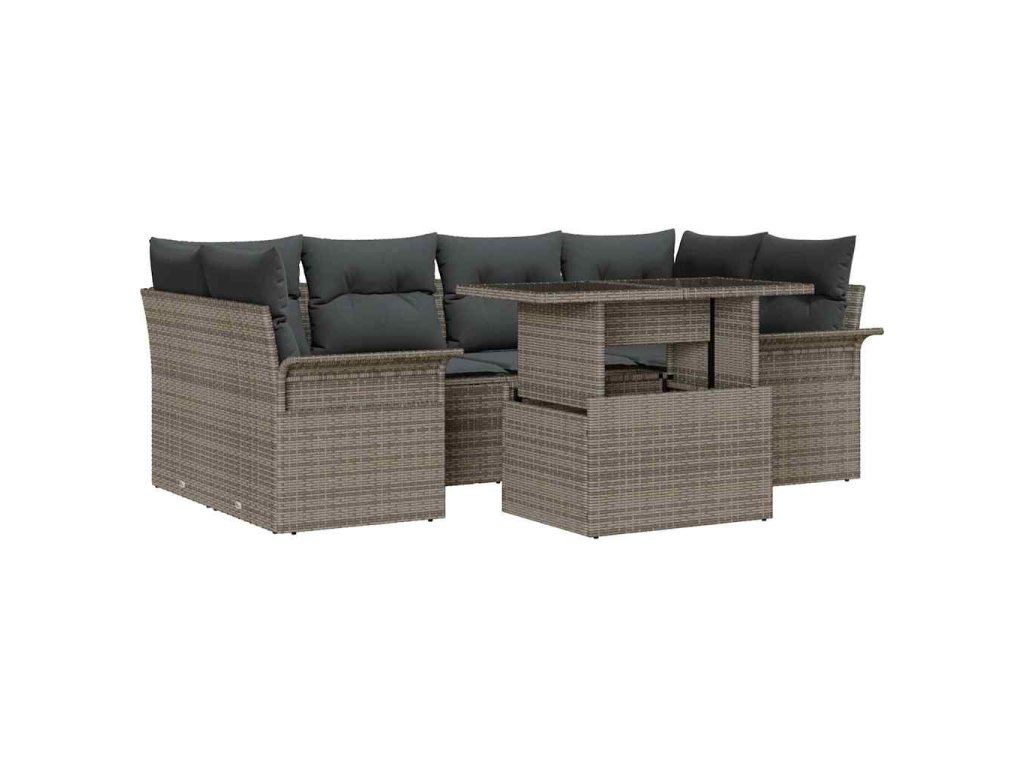 Tato sada zahradních pohovek se 7 kusy od vidaXL je plná stylu a praktických vlastností, což je vítaným místem pro socializaci nebo klidný večer. Elegantní design má moderní šedý ratan a tmavě šedé polštáře, které dodají tvému balkon nebo terase šik vzhled a přitom pojme až šest lidí. Ideální pro pořádání přátel nebo užívání si klidného okamžiku venku.