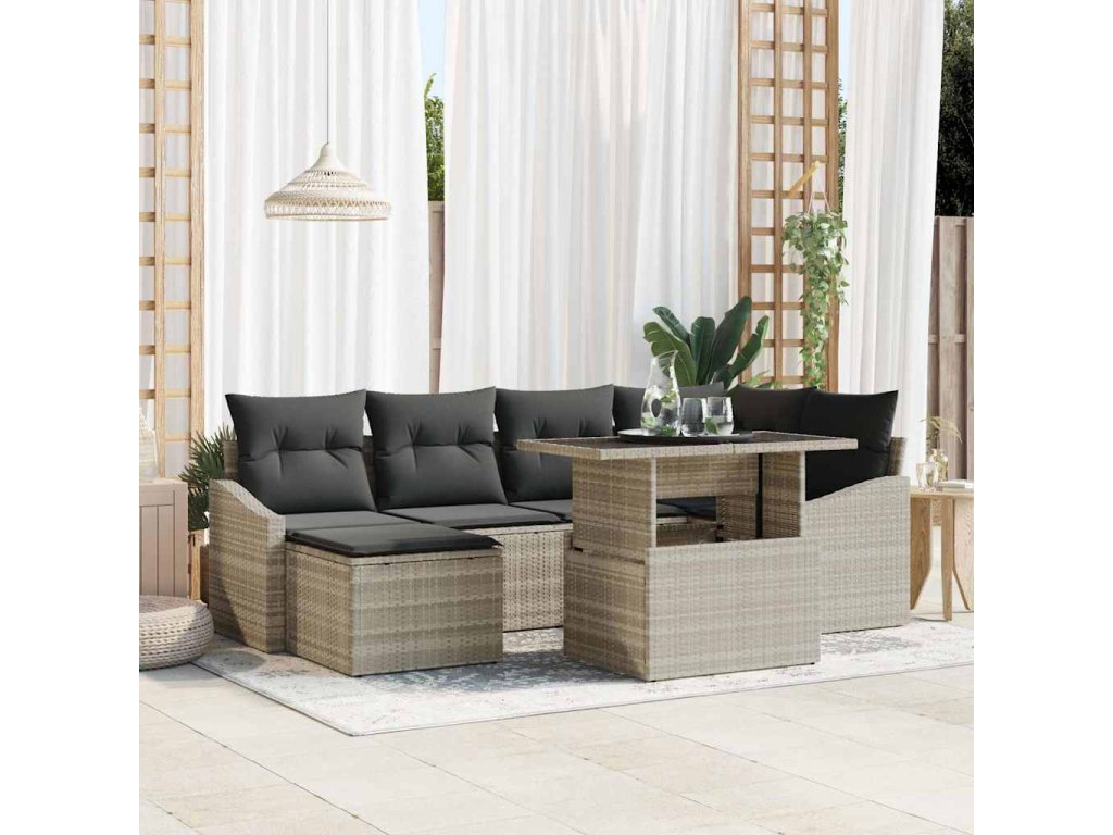 Tato sada zahradní pohovky se sedmi kusy má pohodové vibrace a styl. S moderním vzhledem a krásným světle šedým poly ratanovým povrchem oživí každou verandu, balkon nebo zahradu. Je super pohodlná pro setkání nebo klidné noci pod hvězdami.