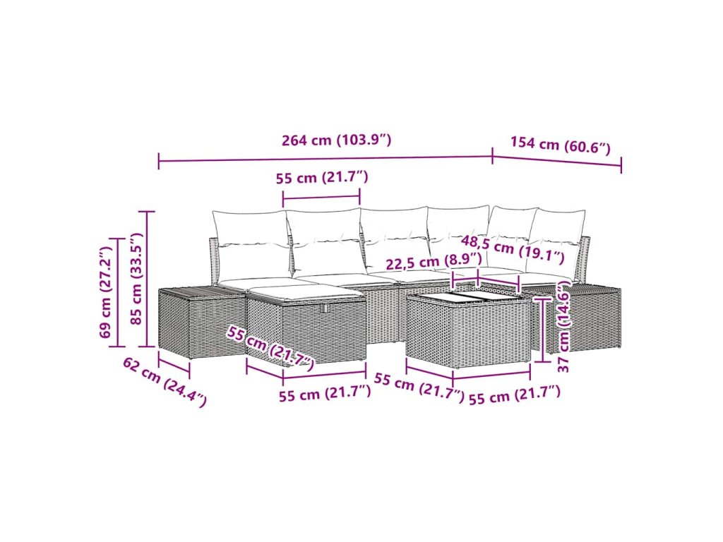 - Dodávka obsahuje: 2 x střední sedadlo s úložným prostorem, 1 x rohové sedadlo s úložným prostorem, 2 x pohovka s úložným prostorem, 1 x taburet s úložným prostorem, 1 x zahradní stůl
