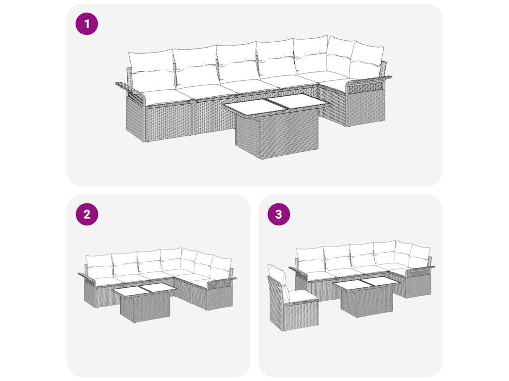 Tato 7-dílná modulární zahradní pohovka je skvělý způsob, jak oživit svůj venkovní prostor. Spojuje moderní styl s pohodlím. Světle šedý ratan a tmavě šedé polstry vytvářejí hladký vzhled, ideální pro setkání s přáteli nebo relaxaci na balkoně.