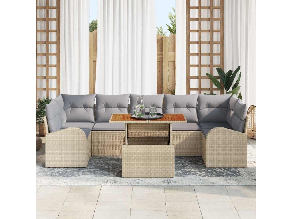 - Stylové kombinace béžového poly ratanu a šedých polstrů dodávají této sadě moderní a chic vzhled, který se hodí do každé zahrady.