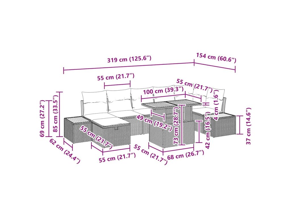 Tahle osm-dílná zahradní souprava je cool a stylová volba pro každou venkovní plochu, skvělá na večírky nebo klidné večery venku. Kombinace béžového polyratanu a krémových polštářů dodá tvému prostoru příjemnou atmosféru, co zapadne do jakéhokoliv stylu zahrady nebo balkonu. Navíc, modulární design ti dovolí uspořádat soupravu podle svých potřeba.