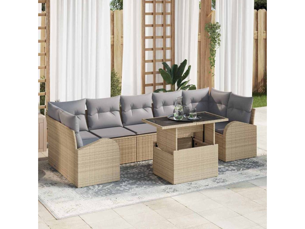 Moderní venkovní jídelní set pro 8 je zaměřen na styl a praktičnost, ideální pro hosty na vaší zahradě nebo terase. Tento set spojuje elegantní vzhled s užitečnými funkcemi a nabízí spoustu prostoru pro jídlo a odpočinek. S krásnými tkanými texturami a elegantním černým provedením promění jakékoli venkovní místo na stylové útočiště, perfektní pro rodiny, neformální schůzky nebo romantické večeře.