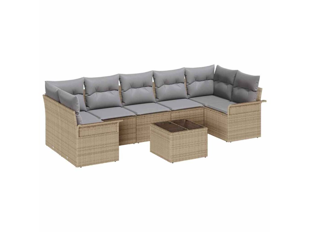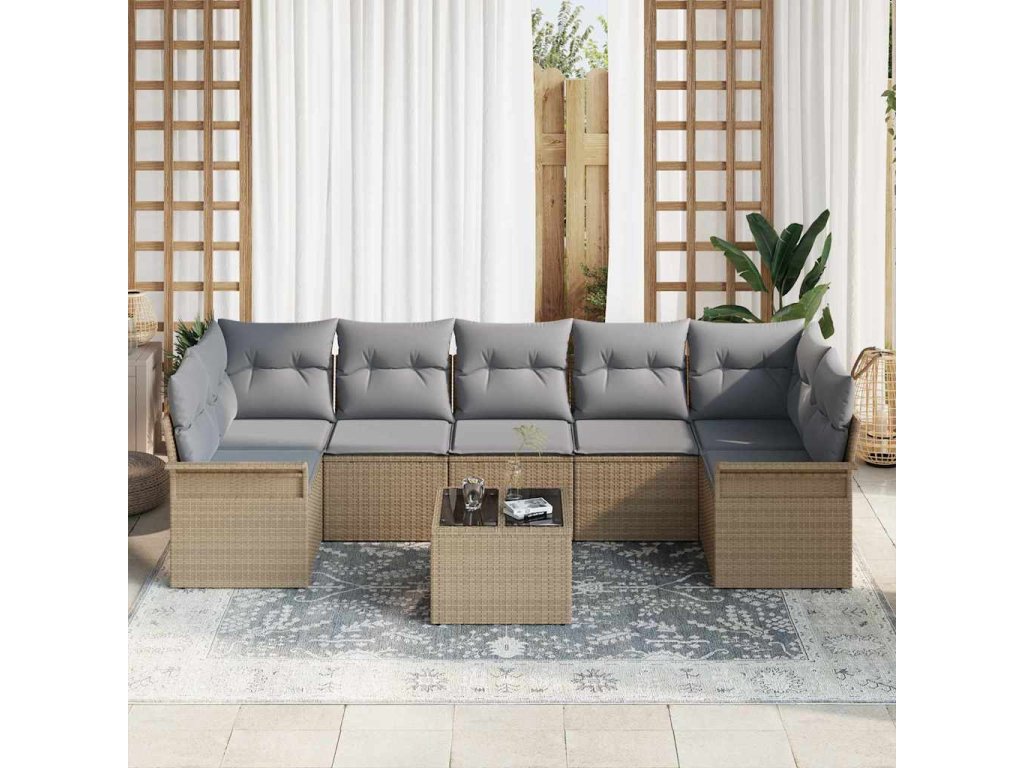 Tato čtyřmístná venkovní zahradní pohovka, s kombinací elegantního béžového poly ratanu a šedých polštářů, ti zajistí pohodlí a styl. Je ideálka pro odpočinek s rodinou nebo kamarády, a modulární design ti dává svobodu ji přeskupit tak, jak tobě vyhovuje, čímž se tvůj venkovní prostor promění v příjemnou oázu.