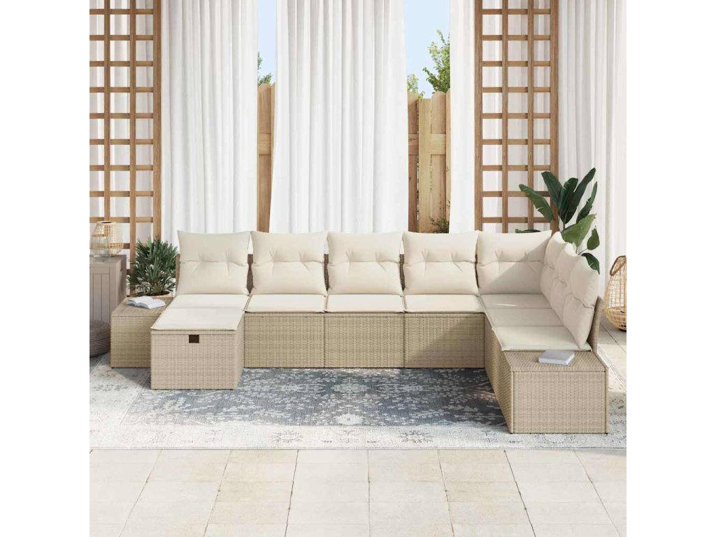 Tato sada zahradních pohovek vidaXL se 8 kusy spojuje moderní design s praktickými funkcemi, takže je skvělá na zahradní párty nebo na relaxaci venku. Vyrobena z pevného poly ratanu a pohodlných polyesterových polštářů v béžovém odstínu, je ideální pro chvíle odpočinku s rodinou a přáteli.