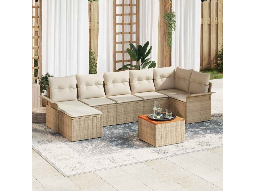 Tato zahradní pohovka je navržená tak, aby vylepšila vaše chvíle odpočinku a udělala váš venkovní prostor super. Moderní béžový poly ratan design smíchaný se smetanovými polštáři vytváří příjemnou atmosféru, ideální pro rodinné setkání nebo pohodu venku.