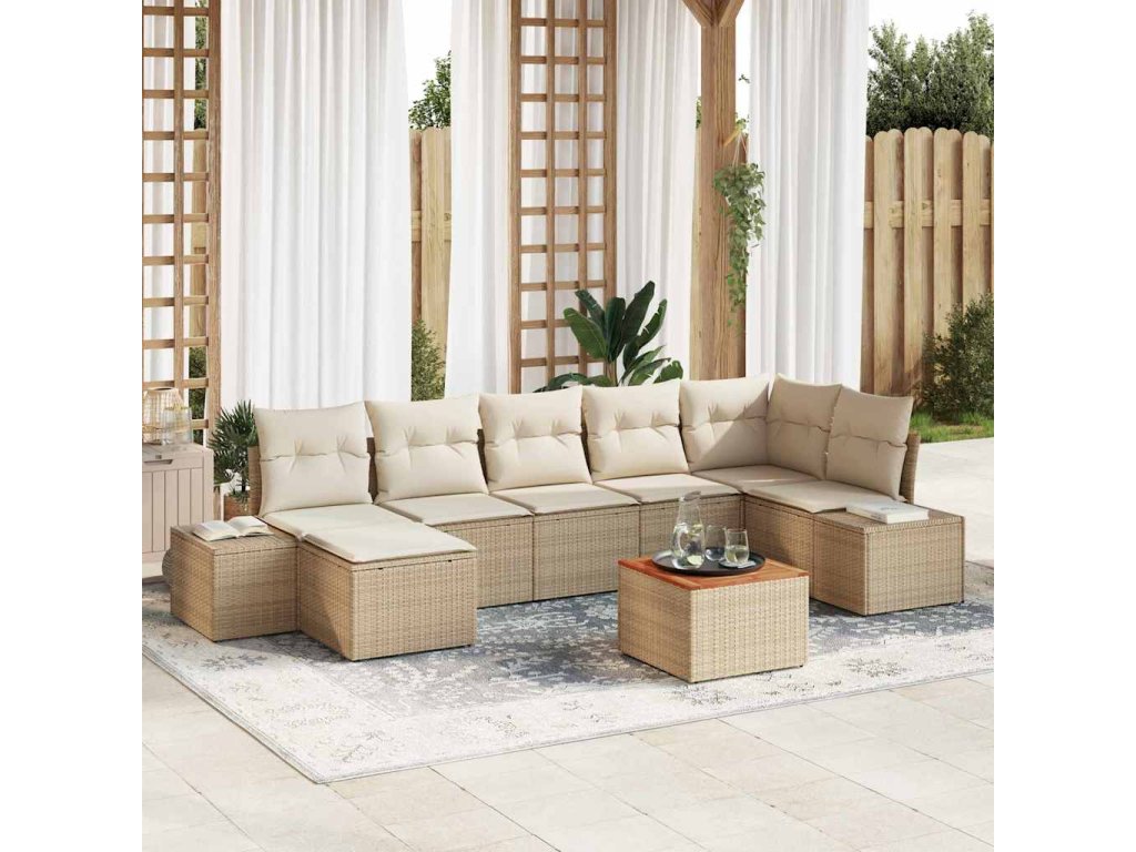 - Součásti: Tato komplexní souprava obsahuje tři centrální sedadla, rohové sedadlo, dvě boční pohovky, taburet a zahradní stůl. Každá součást je pečlivě navržena k maximalizaci pohodlí a použitelnosti, čímž vytváří soudržnou sestavu.