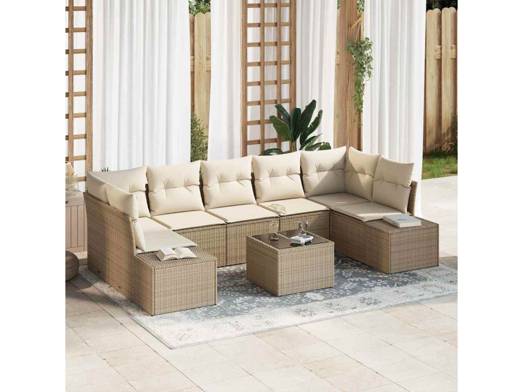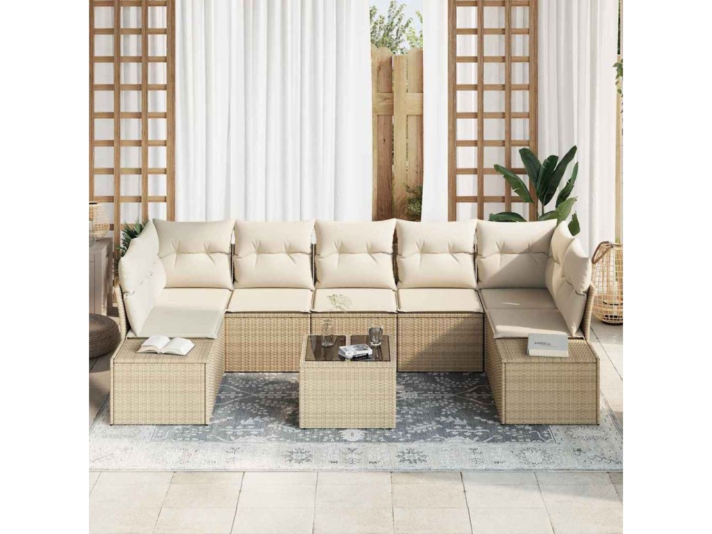 Tato zahradní sofa sada je dokonalou kombinací stylu a komfortu, ideální na lenošení venku nebo na pořádání akcí. S moderním designem a elegantní béžovou a smetanovou barvou pojme až sedm lidí, což je perfektní pro rodinu a přátele. Její elegantní linie a prostorný design vytvářejí přátelskou atmosféru, zatímco odolné materiály zajistí, že bude vypadat skvěle po celý rok. Užij si kouzlo venkovního života s touto zahradní sofa sadou jako centrem tvého prostoru.
