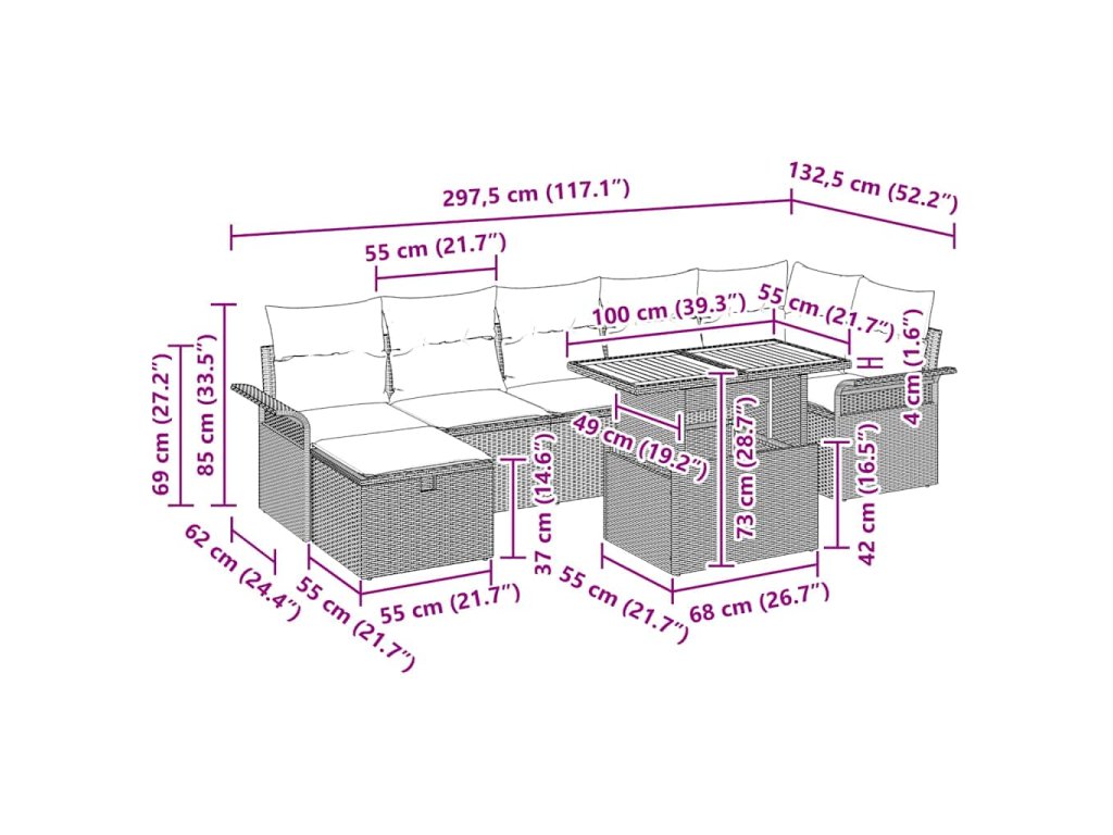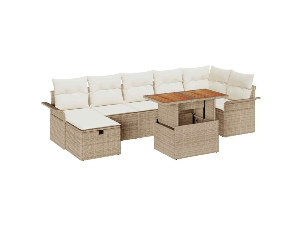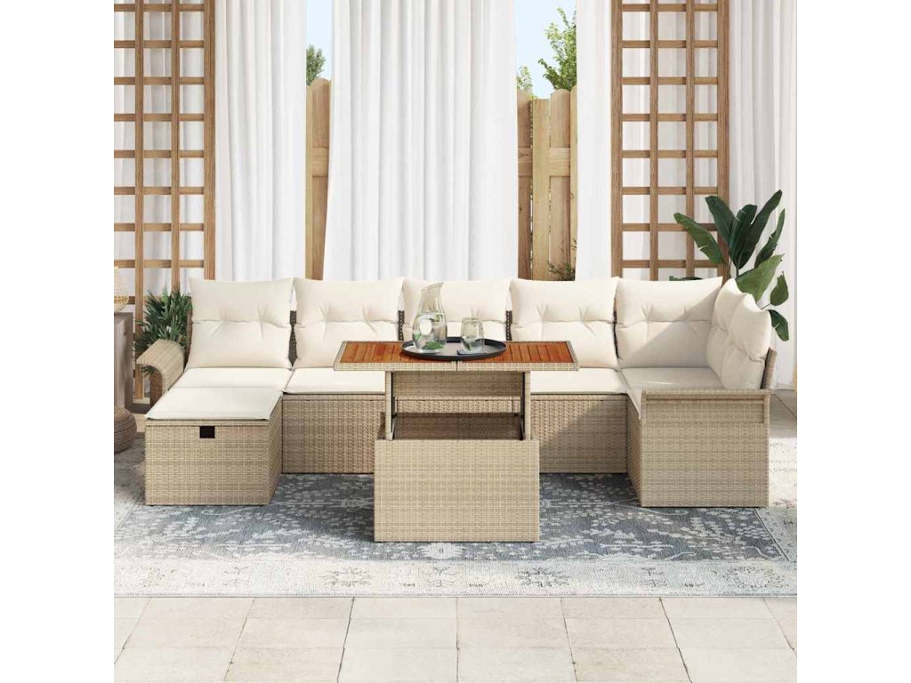 - Modulární komponenty: S kombinací středových a rohových sezení, sofas s opěrkami na ruce, taburetem a stolem ti tahle souprava dává volnost v uspořádání. Každý kus má praktický úložný prostor, kde si skládáš polštáře a drobnosti venku v pořádku, a přitom zůstává všechno funkční.