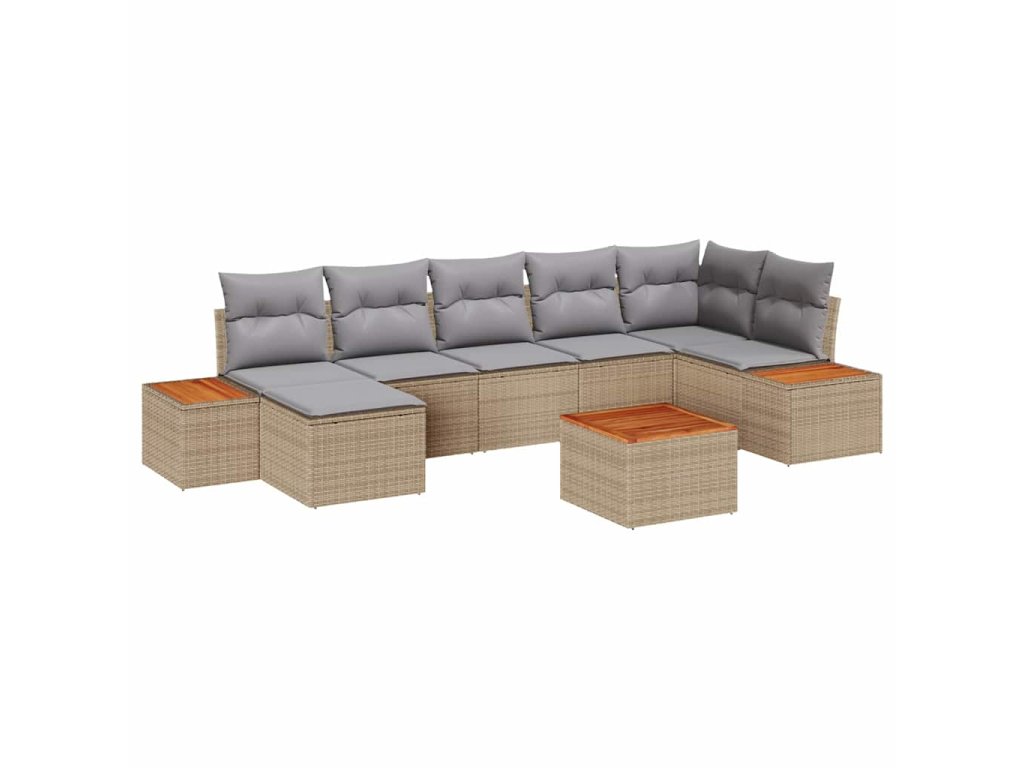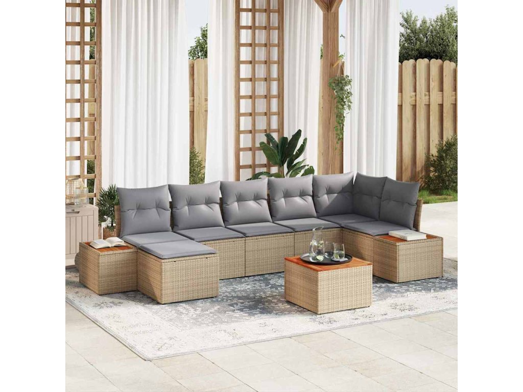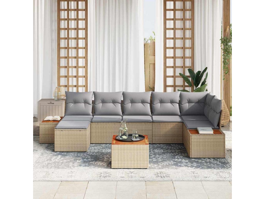 - Materiál poly ratan: Tato pohovková sada je vyrobená z kvalitního poly ratanu, takže je odolná a stylová. Odolnost proti UV záření zaručuje dlouhou životnost a udržuje barvu i po celodenním slunci. Tkaná textura působí sofistikovaně v moderních venkovních prostorách.