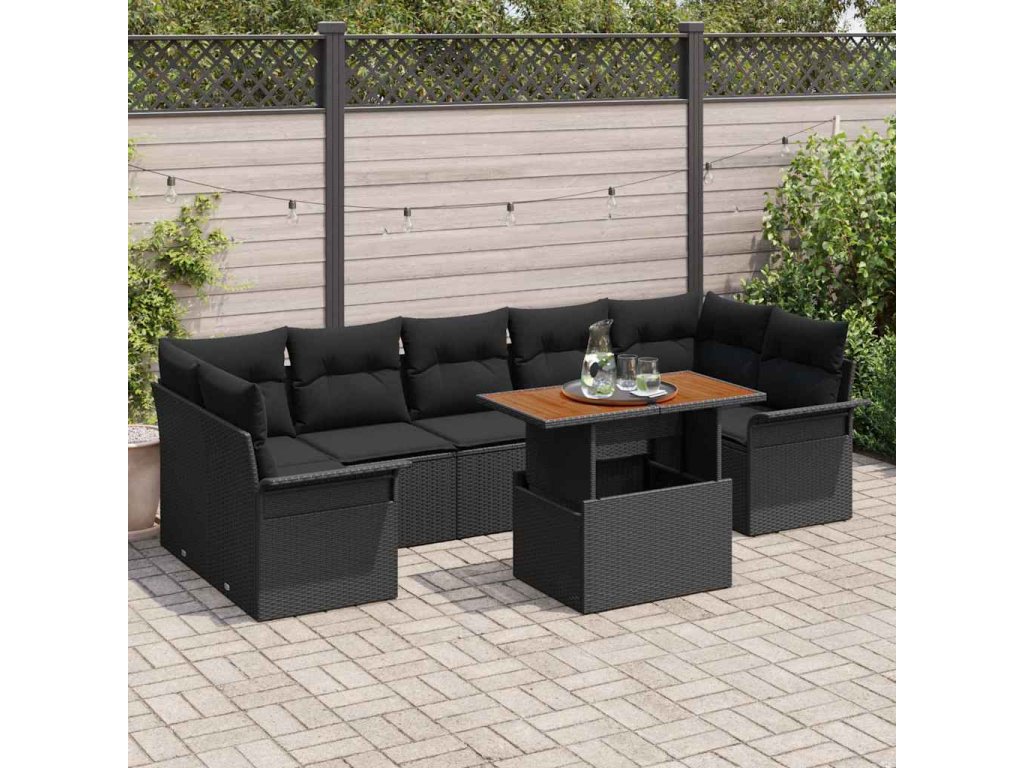 - Udržitelné materiály: Vyrobeno z odolného polyratanu, sada zahradního sofa nejenže dobře vypadá, ale také zaručuje dlouhověkost. Polyratan je známý svou odolností proti ultrafialovému záření, což zajišťuje, že sada si udrží svůj živý vzhled sezónu po sezóně. Robustní práškově lakovaný ocelový rám zajišťuje stabilitu a odolnost vůči povětrnostním vlivům. K přidání přirozeného tepla je použito masivní akáciové dřevo pro povrch, což spojuje funkčnost s atraktivním rustikálním nádechem.