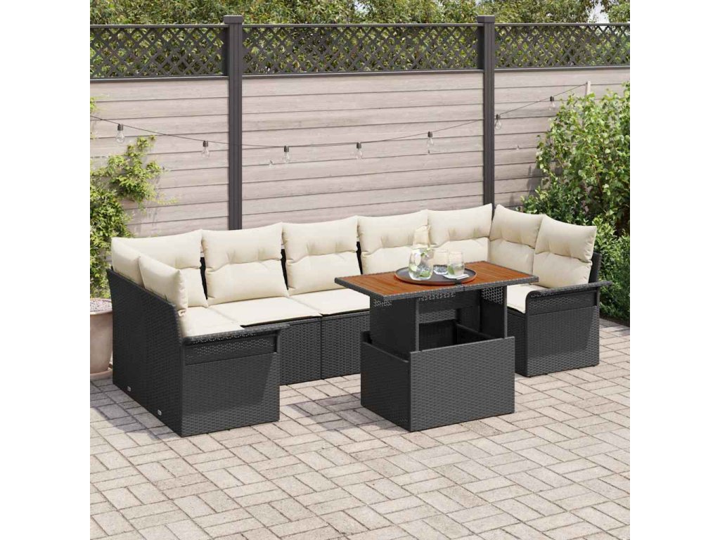 - Udržitelné materiály: Vyrobeno z odolného polyratanu, sada zahradního sofa nejenže dobře vypadá, ale také zaručuje dlouhověkost. Polyratan je známý svou odolností proti ultrafialovému záření, což zajišťuje, že sada si udrží svůj živý vzhled sezónu po sezóně. Robustní práškově lakovaný ocelový rám zajišťuje stabilitu a odolnost vůči povětrnostním vlivům. K přidání přirozeného tepla je použito masivní akáciové dřevo pro povrch, což spojuje funkčnost s atraktivním rustikálním nádechem.