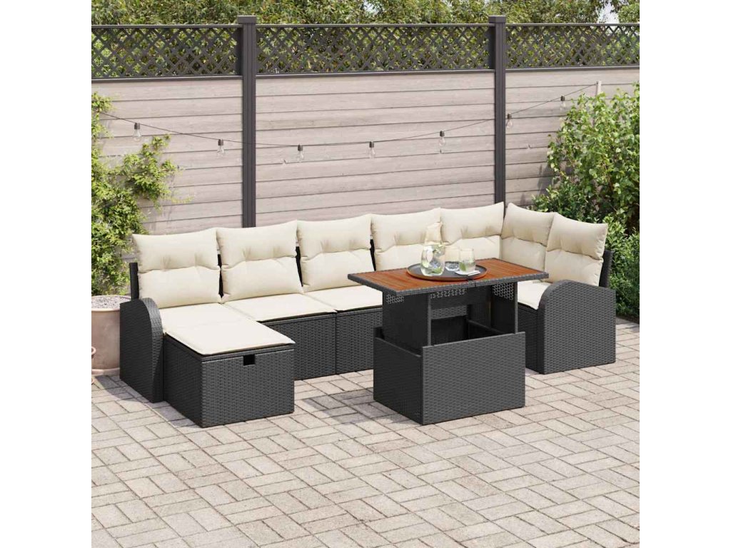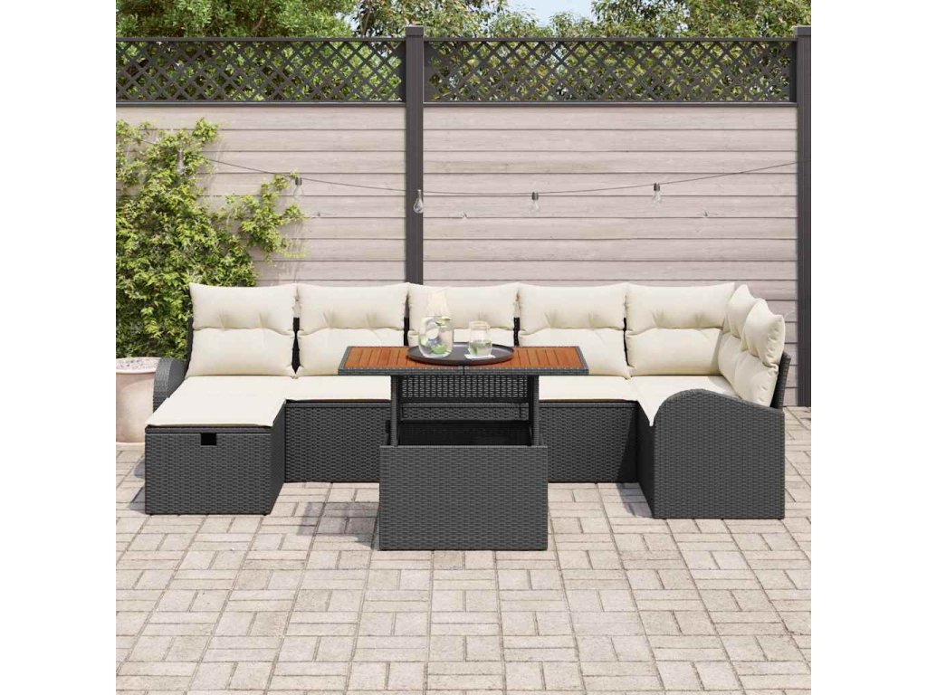 - 3 x centrální sedadlo včetně úložné funkce, 1 x rohové sedadlo včetně úložné funkce, 2 x armsofa včetně úložné funkce, 1 x podnožka s úložnou funkcí, 1 x zahradní stůl