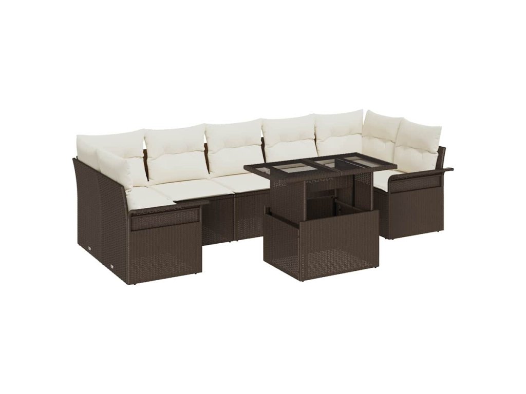 Tato 8dílná zahradní pohovka s polštáři je ideální pro odpočinek a jídlo venku, jak na balkoně, tak na zahradě. S moderním designem a lákavými hnědo-krémovými barvami je pohodlná a funkční, což ji dělá skvělým místem pro shromáždění rodiny a přátel během léta nebo jara.