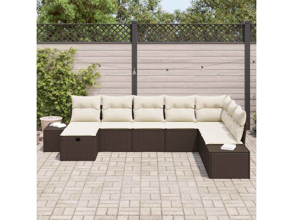 8dílná zahradní pohovka vidaXL spojuje moderní styl s praktičností—ideální na zahradní párty nebo prostě relaxaci. Je vyrobená z odolného hnědého poly ratanu s měkkými krémovými polstry, takže je to příjemné místo pro odpočinek s rodinou a přáteli.
