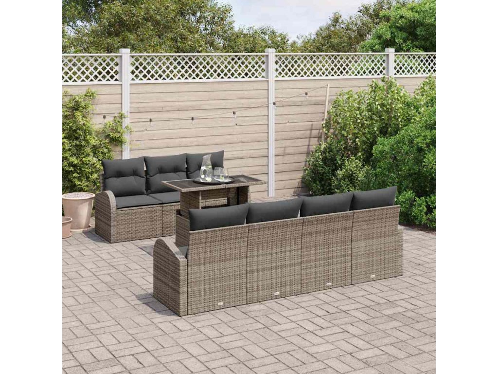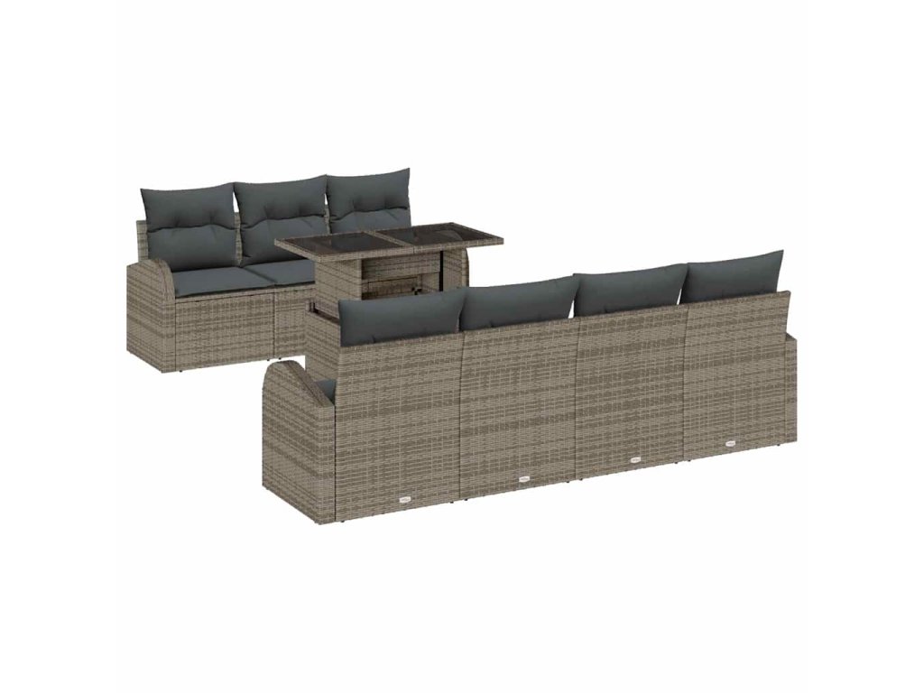 Tato sada zahradních pohovek je zaměřená na styl a praktičnost, což ji dělá skvělou pro oživení venkovních prostor jako jsou terasy, balkony nebo zahrady. Přichází jako osmidílná sada a má moderní vzhled, který spojuje pohodlí s dobrou atmosférou, čímž vytváří přívětivé místo na setkávání a socializaci.