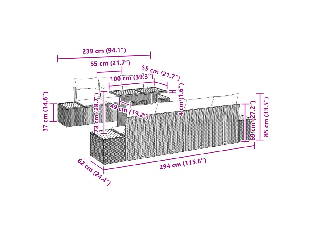 - Dodáváno: 4 x boční pohovka se storage, 3 x střední sedadlo se storage, 1 x zahradní stůl