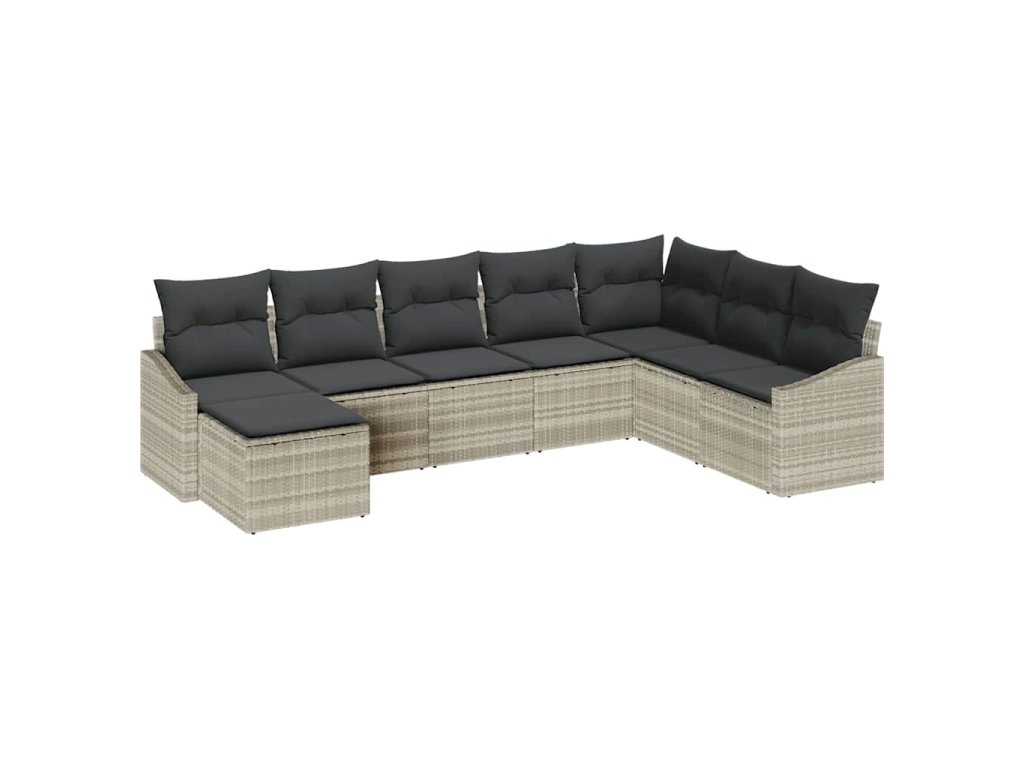 Tento zahradní jídelní set je parádní na venkovní jídla, poskytuje ti chytré a praktické místo pro hosty. Můžeš se pohodlně usadit na prostorné rohové pohovce, která unese až 8, s elegantním světle šedým poly ratanovým rámem a měkkými černými polštáři, co skvěle vypadají kdekoli na venku.